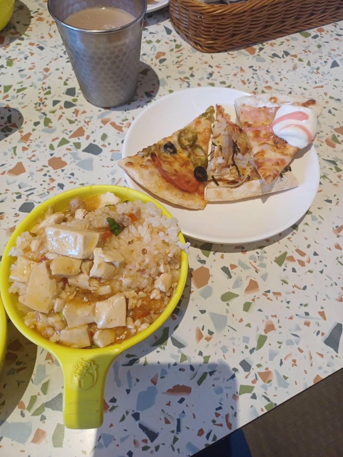 【麻婆豆腐飯&奶茶及同上張的三片披薩】: