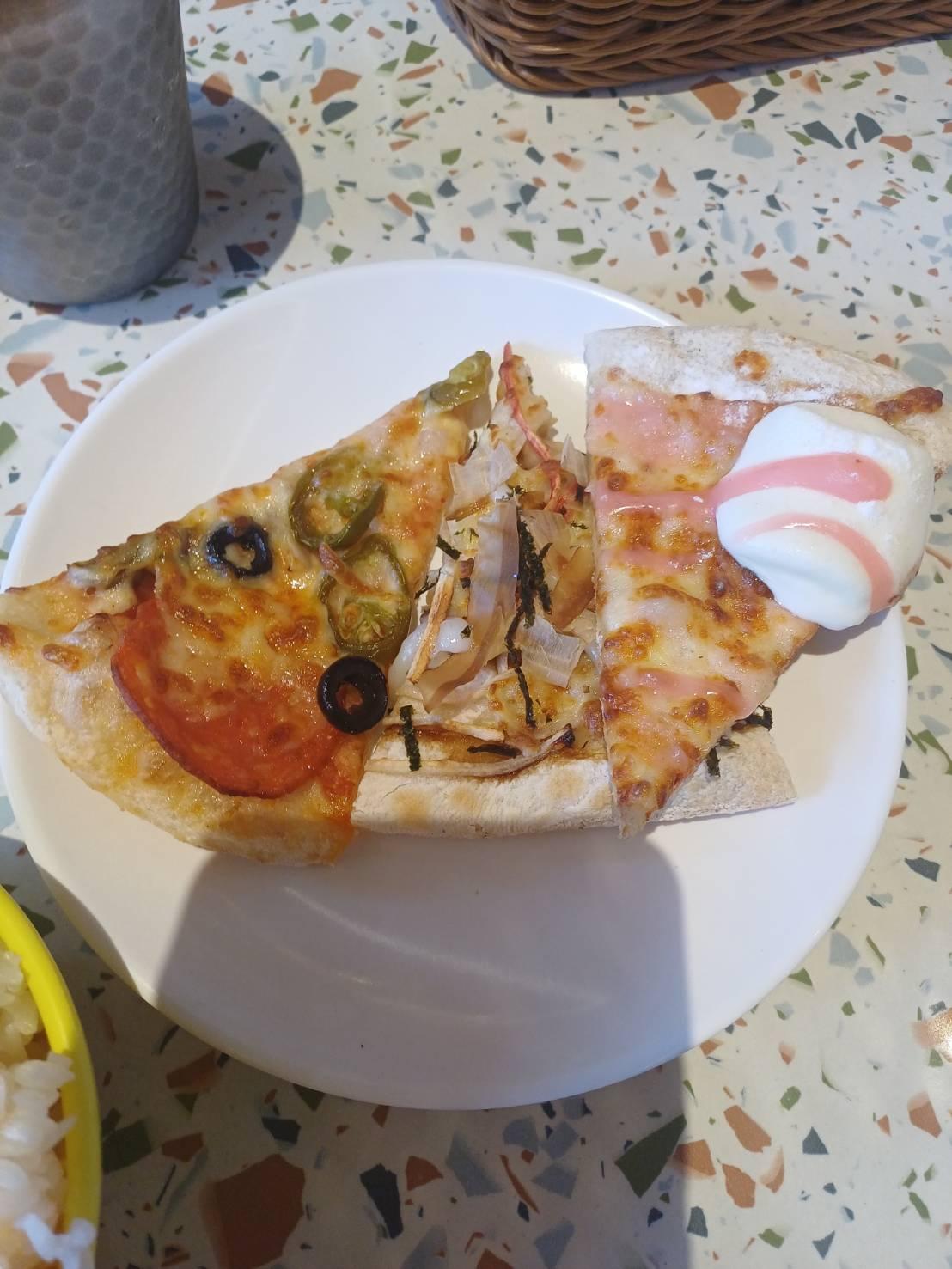 二片鹹披薩到披薩區取的披薩,以及一片雷剋司兄分給我的草莓棉花糖甜披薩,從鹹披薩口味的喜好上較喜歡於墨西哥辣椒,甜披薩棉花糖和草莓醬,與乳酪絲組合起來,有香甜及香濃的口感。