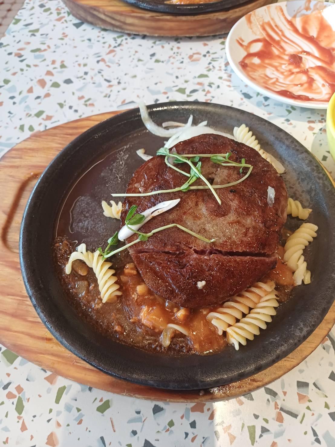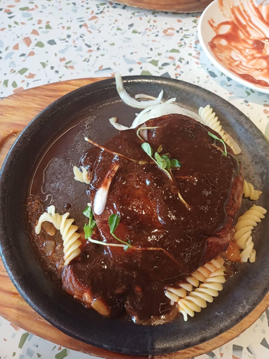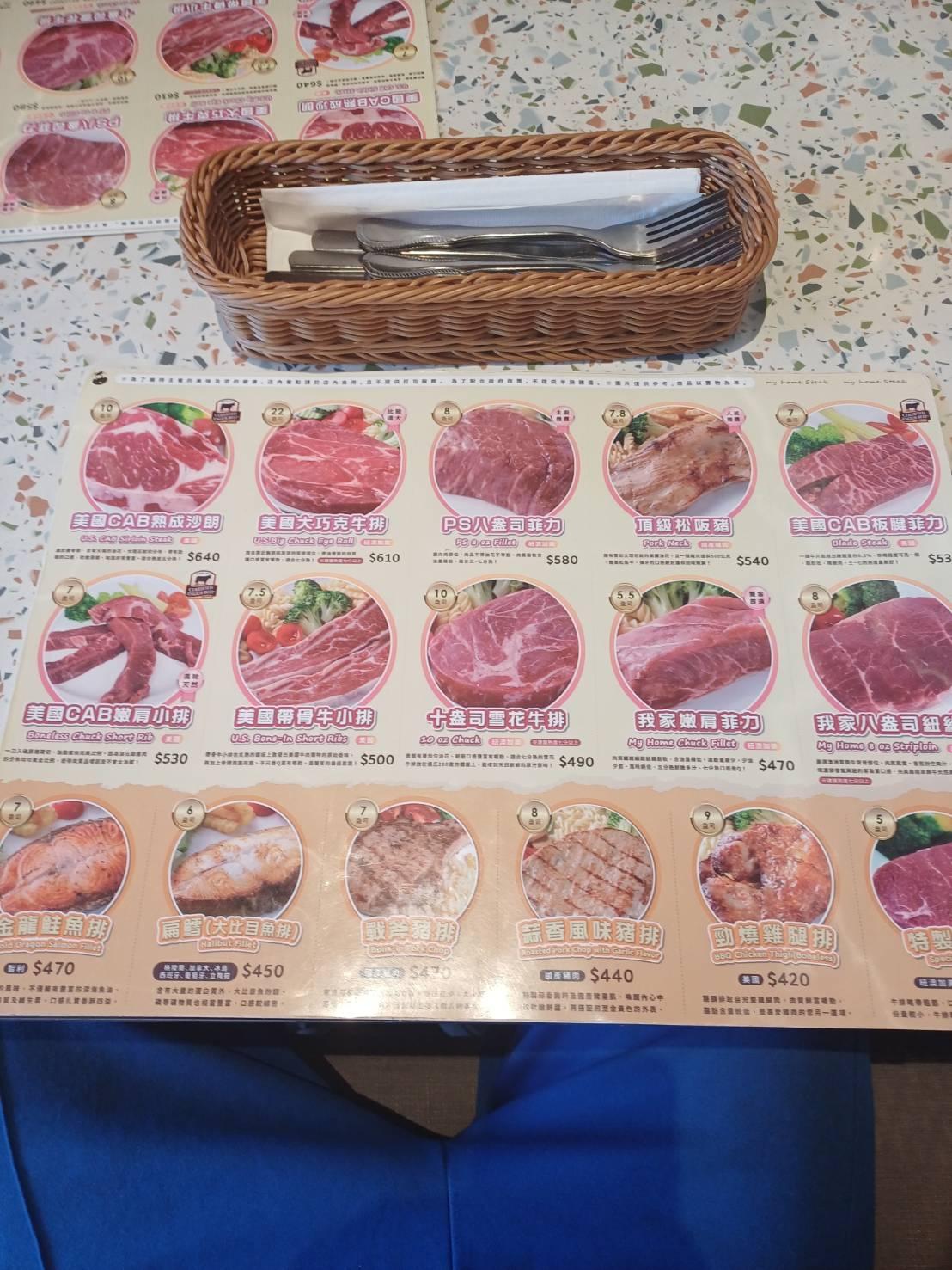 牛排上桌時,服務員會要求先切開牛排,確定為所點熟度,牛排底部含一些筆管麵及洋蔥,本身的軟嫩度同前幾次來光顧時還不錯,牛排醬&美式辣醬淋在牛排上,整體口感算是美味。一客牛排配自助區吃到飽,全價格約五百多一餐下來還算是實惠。