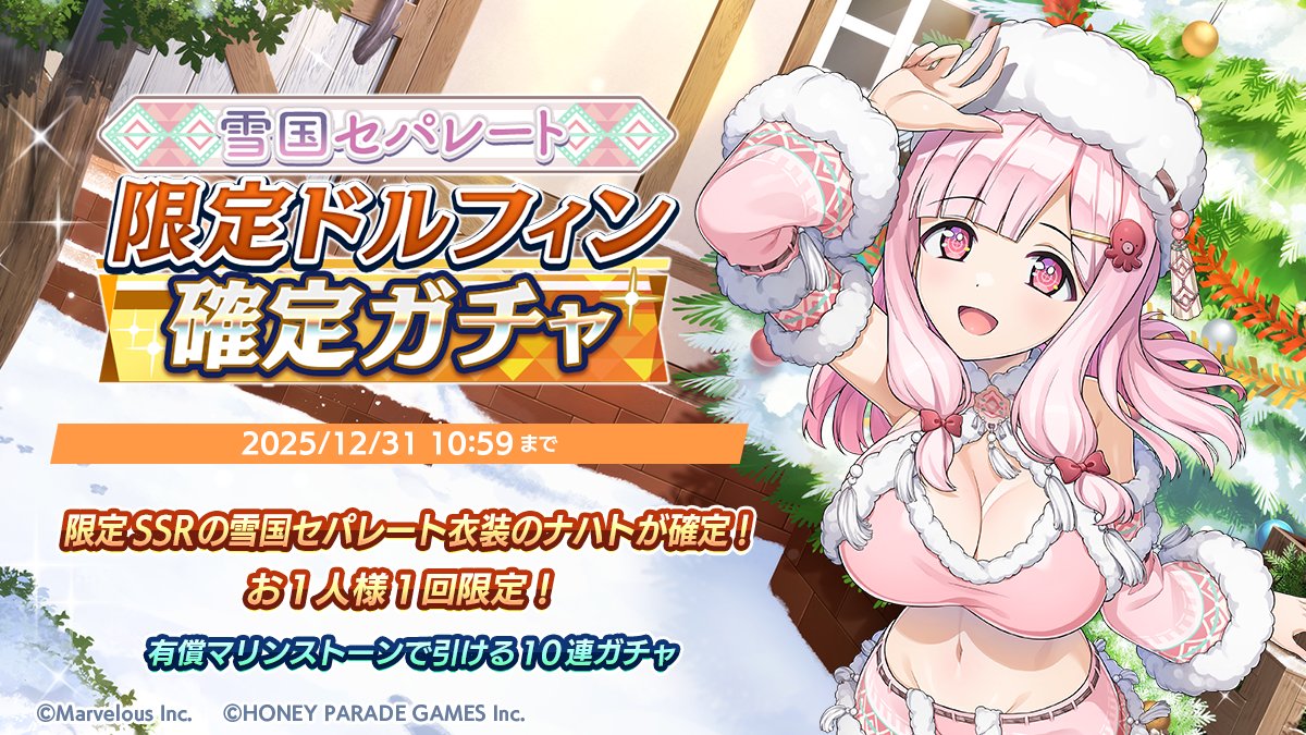 本次 PU 的聖誕節新海豚為 SSR 娜哈特(雪國兩件式) ナハト(雪国セパレート) 。※本卡池新衣裝為期間限定十連抽,第 10 抽必定為「娜哈特(雪國兩件式)」,限使用購買的蒼洋石進行抽卡,限抽 1 次;獲得的「娜哈特(雪國兩件式)」已經是 Lv.80、最大覺醒