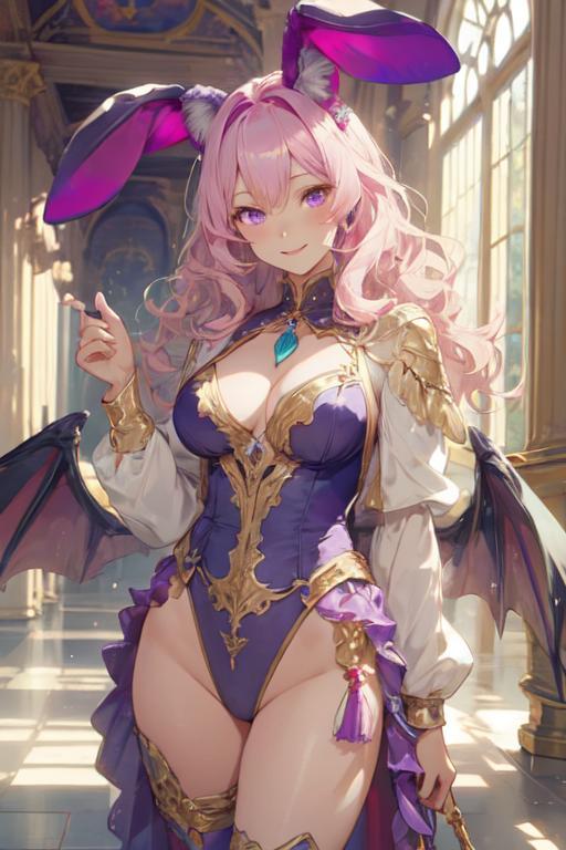 一名有著大波浪粉色捲髮的大美女出現在鏡子中,她的頭上戴著類似飾品的紫色兔耳,凹凸有致又白皙透亮的身材在法師紗衣下若隱若現,紫色眼睛如閃耀的寶石般明亮有神。