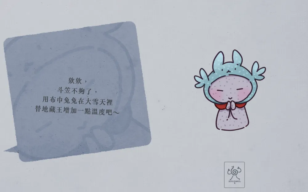 欸欸,斗笠不夠了,用布巾兔兔在大雪天裡替地藏王增加一點溫度吧~