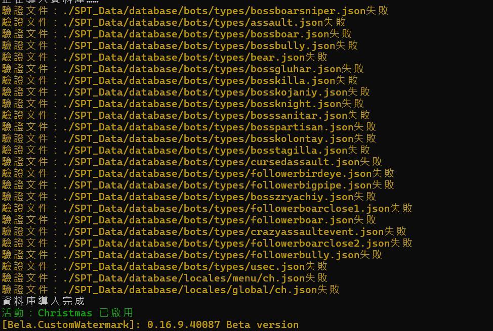 ※出現驗證失敗的黃字是正常的,因為SPT對database文件夾有驗證保護,一旦修改就會出現以下文字,但並不影響遊玩(我只會搞翻譯,用dll搞mod我不會)※