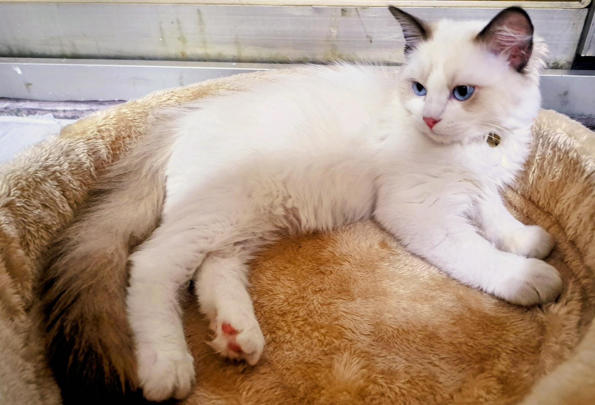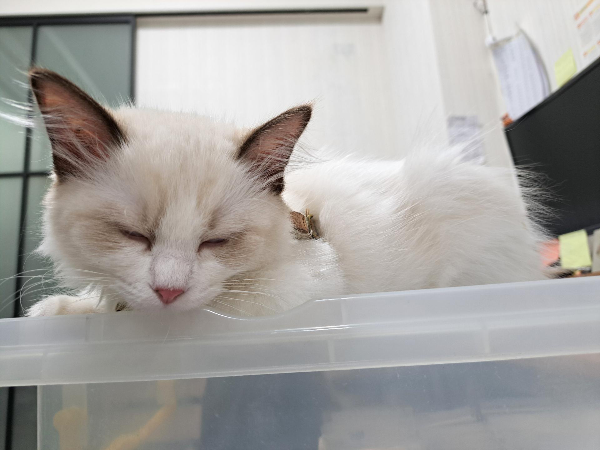現在她好像慢慢習慣跳進貓窩緩衝。