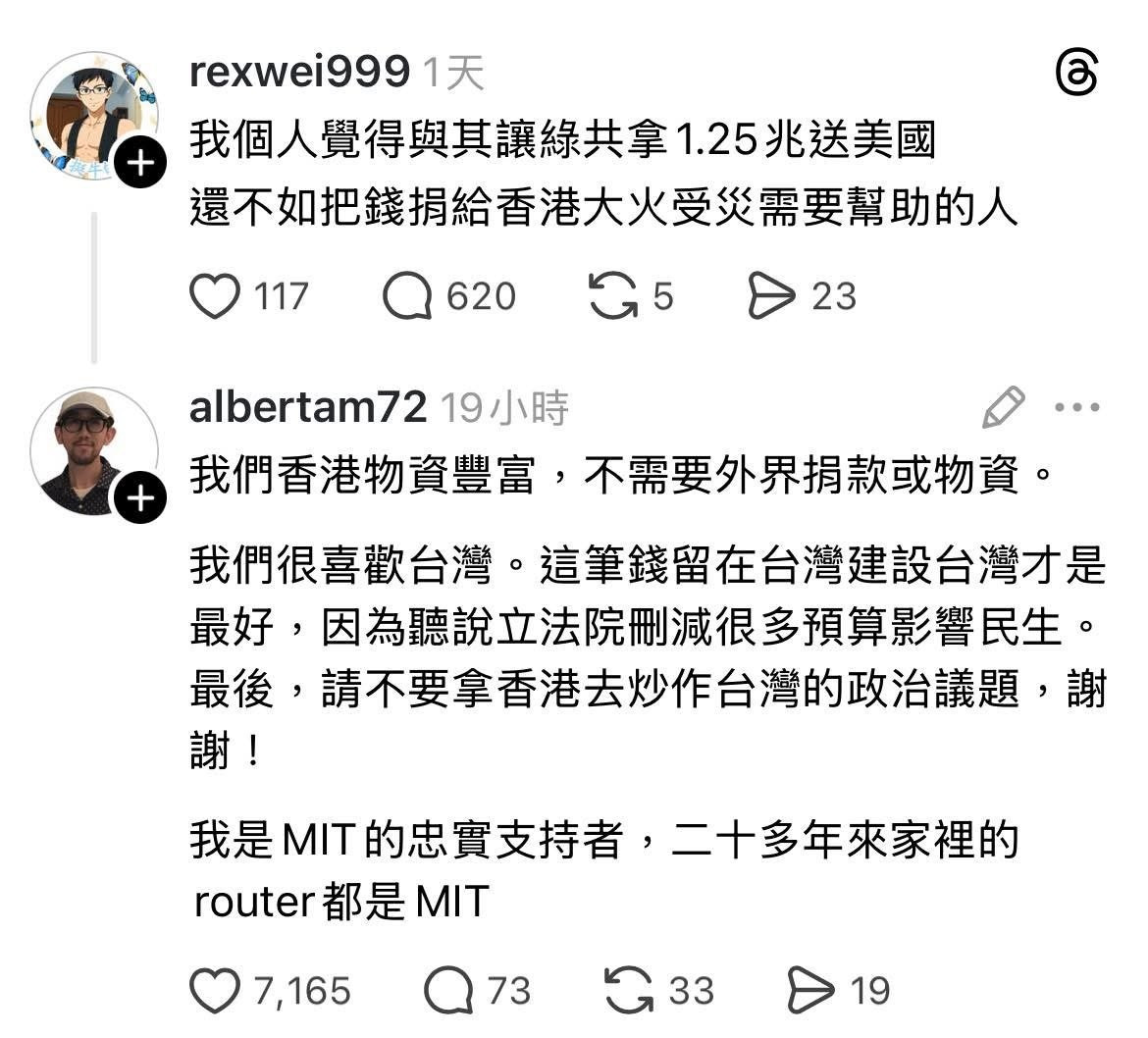 香港人表示 : 請把這筆錢留在台灣建設台灣就好