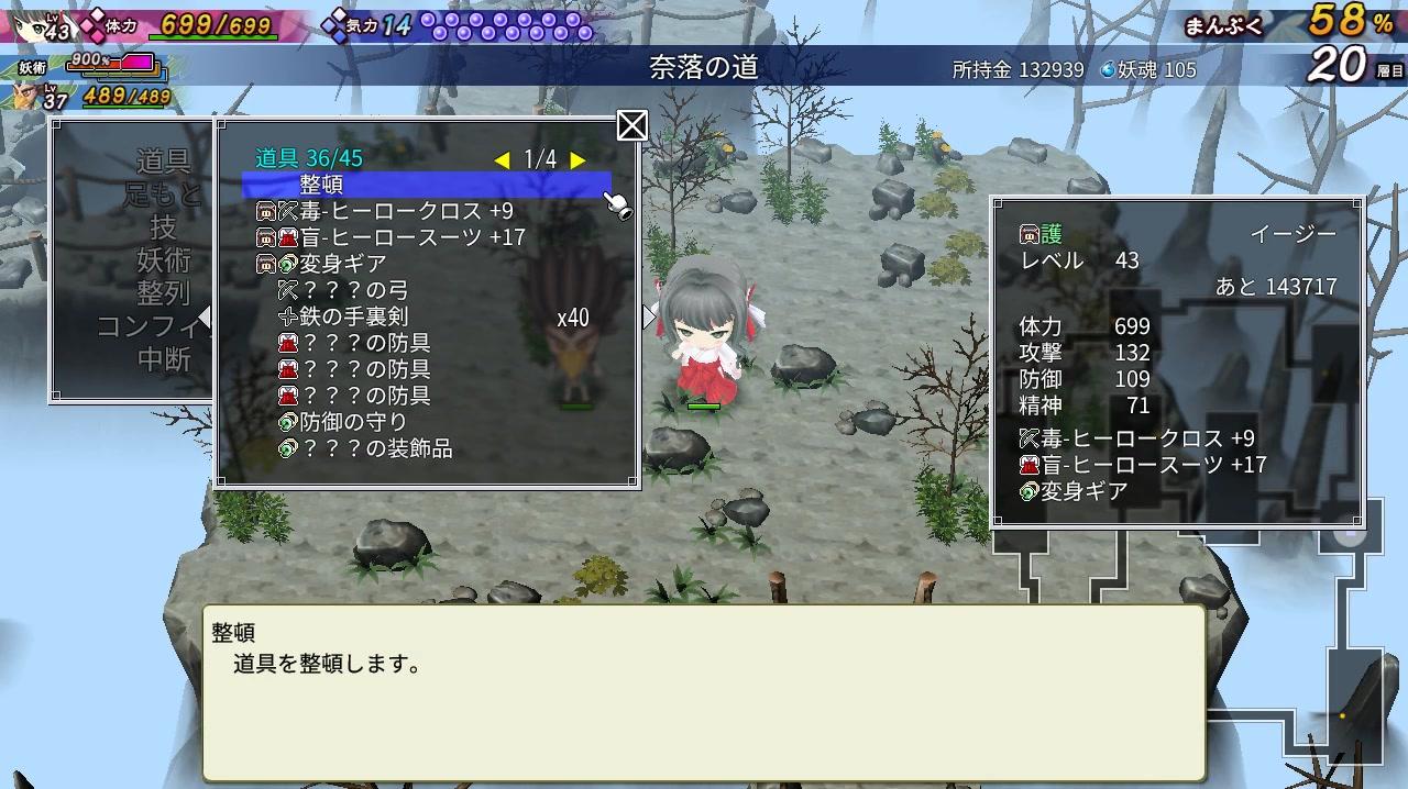 如果在一般難度,進入迷宮後會重新從等級1開始,不過之前因為等級提升學到的技能會保留,回到神社除了整理背包,也要記得前往保管處,出戰的妖怪會因為戰鬥獲得妖力,50、150、300妖力的時候都可以讓他們覺醒能力,打怪有時會掉落妖魂,可以在保管處提升怪物的攻擊、防禦或精神,因為每一隻妖怪最多只能使用50妖魂,所以專精一向能力會比平衡點來得更好,初期建議全點體力,靠走位可以讓妖怪成為肉盾。