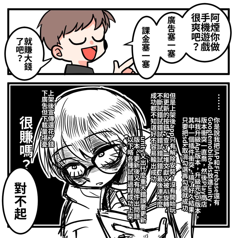 每次輸出有問題都想鬼轉做pc遊戲,但又覺得手機遊戲做完了不輸出很可惜,就這樣做到現在