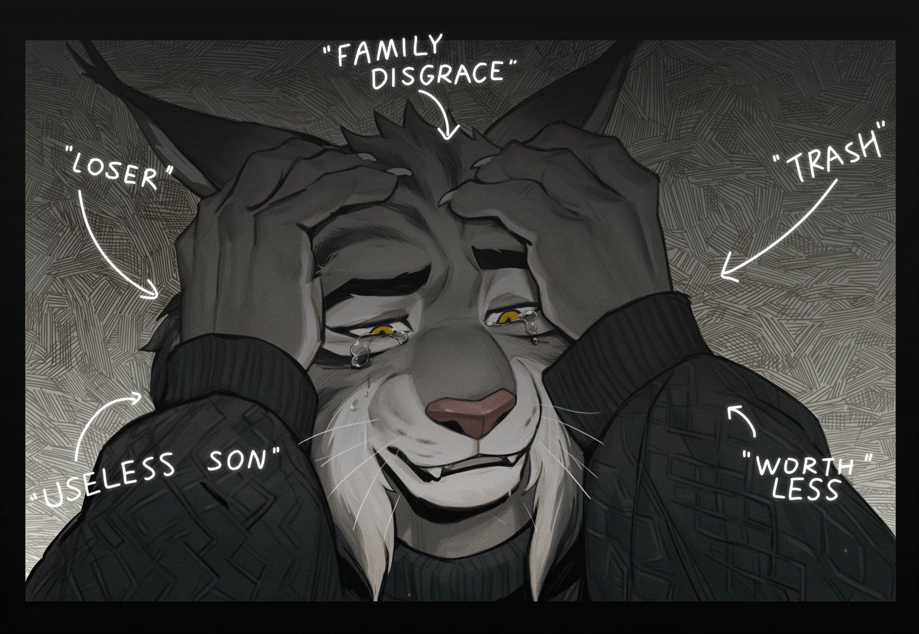 ▲"魯蛇""沒用的兒子""家族知恥""垃圾""廢物"這張創作充分展現寶柏是如何被家族逼瘋的。(創作出處@Sechell_uwu)