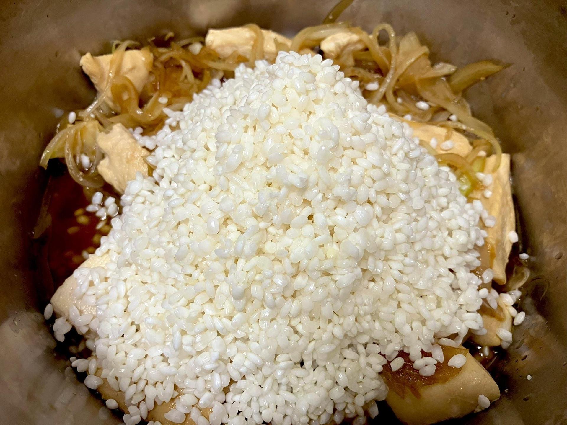 1、首先將生米洗好,浸泡約半小時,期間將雞胸肉煎好起鍋、接著炒洋蔥