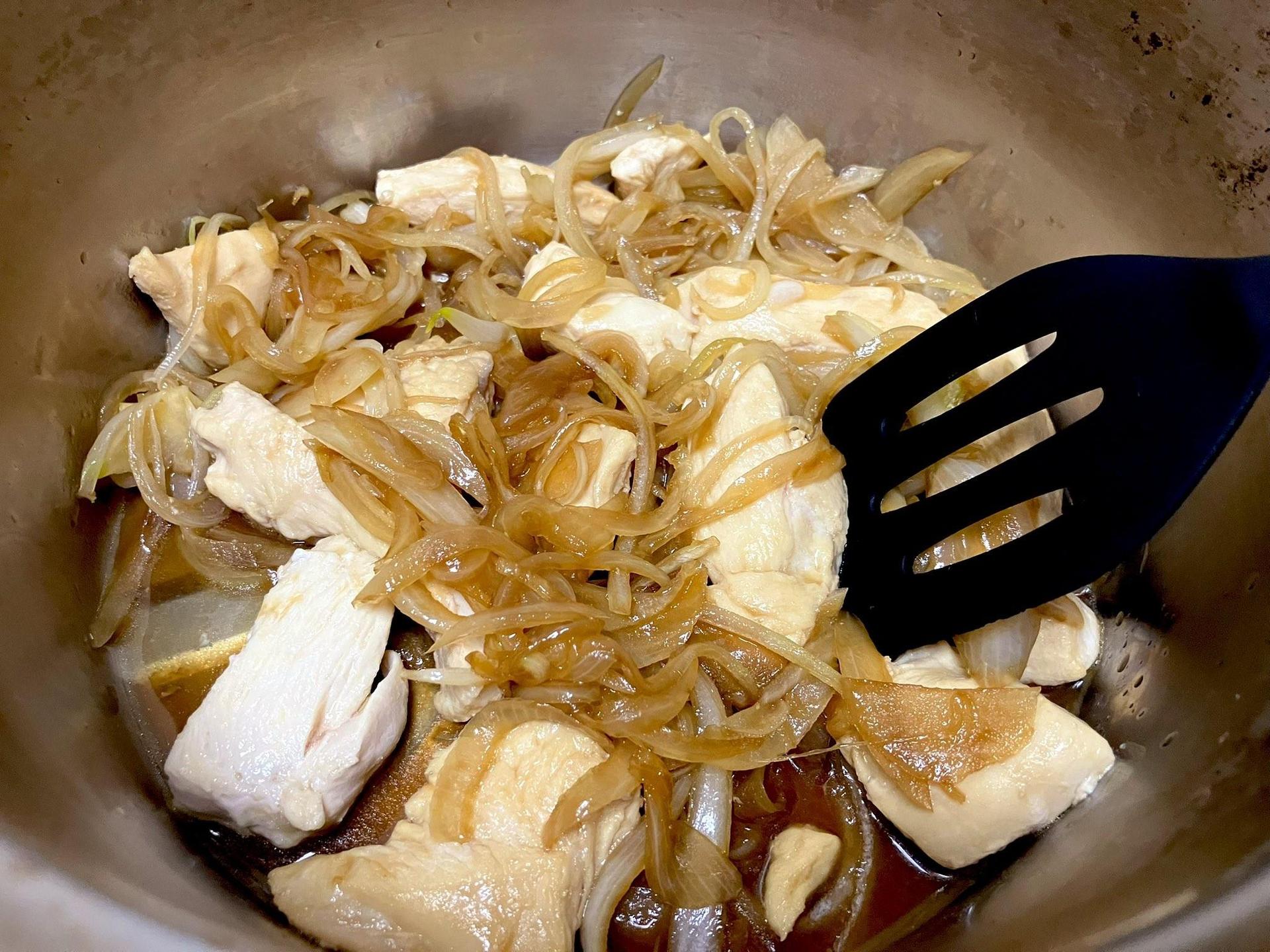 2、炒至半透明後,倒入混合好的A以及煎好的雞胸肉,小火煮滾料與醬汁