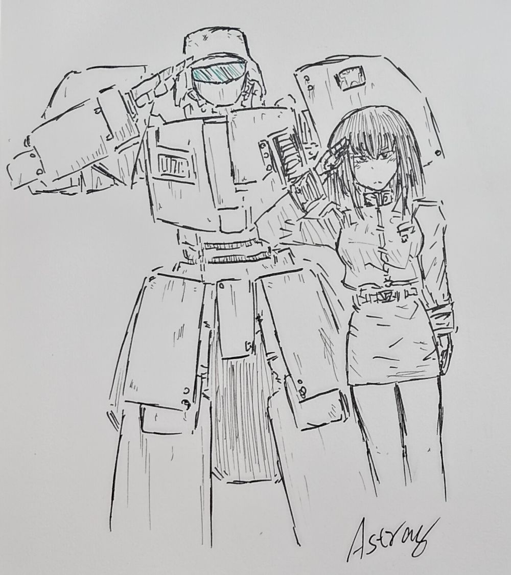 角色及裝甲一同敬禮的姿勢,感覺有一種使命必達,及在一個嚴肅場合正準備執勤的既視感。