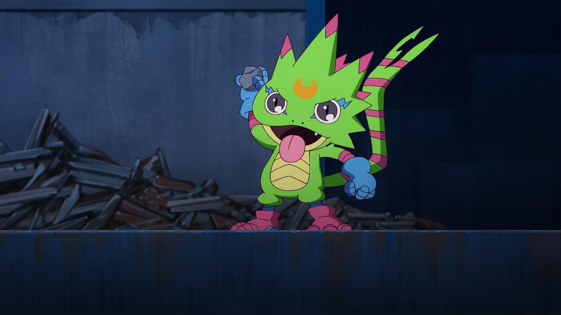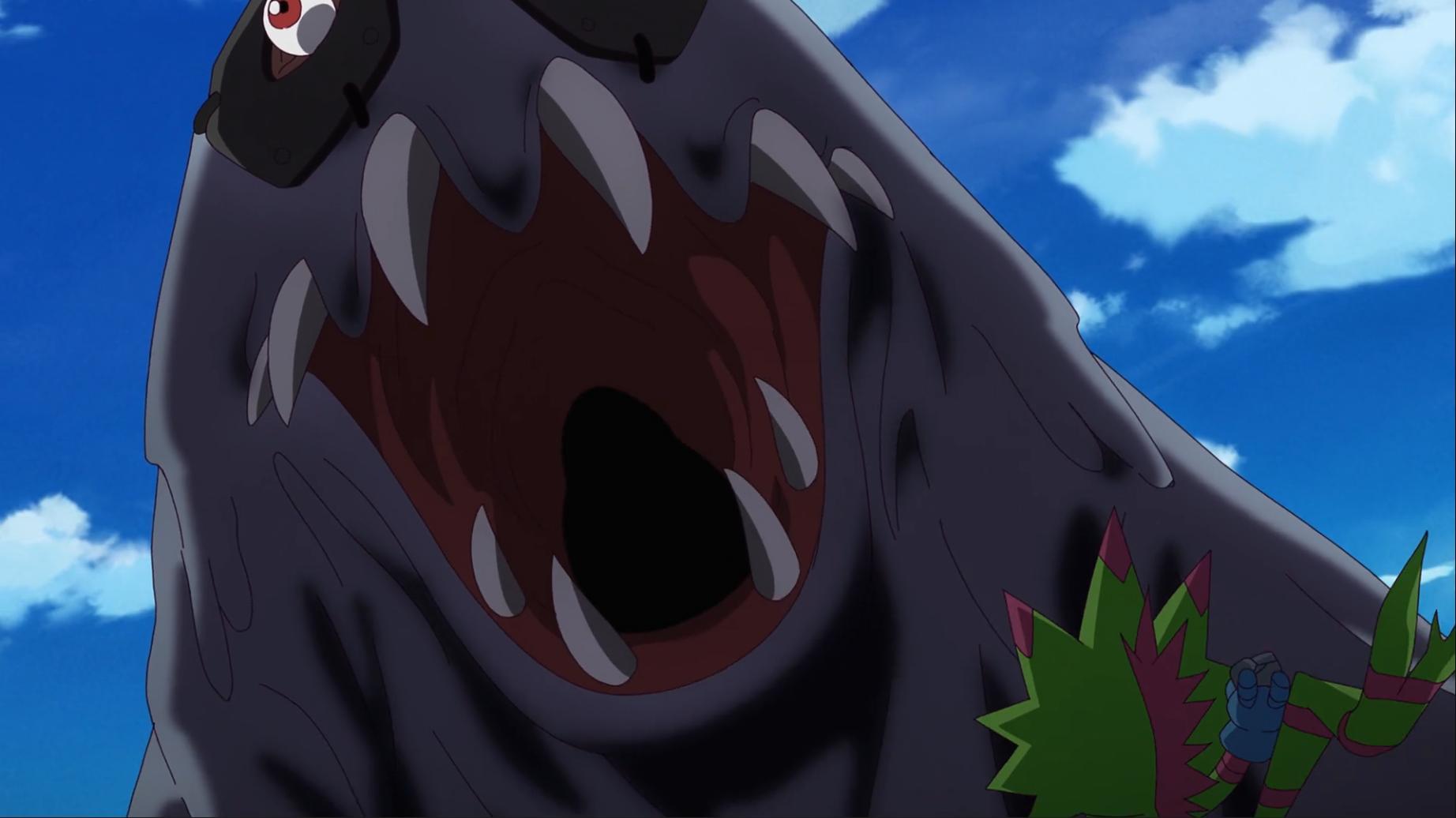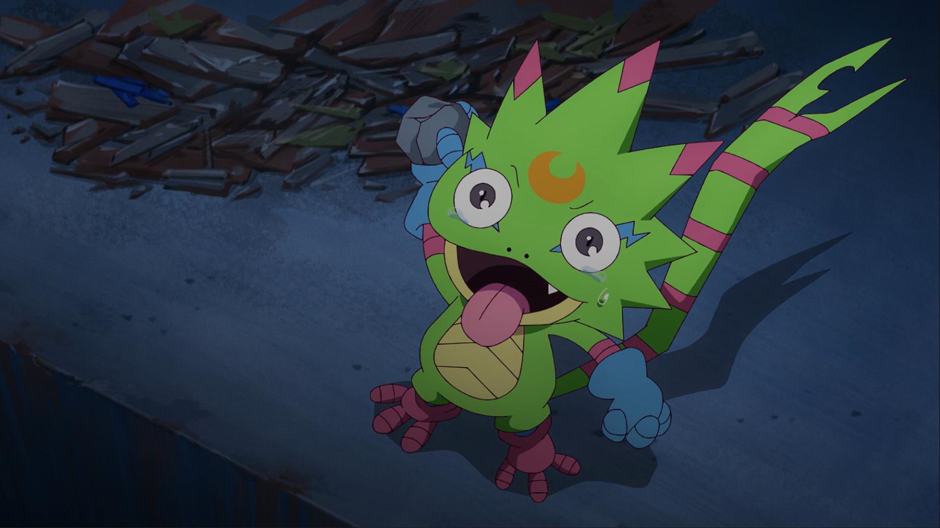 壁虎獸知道智郎這次是說真的 他拿起小石頭往河裡丟沒想到卻意外引出了巨大的爛泥獸 小歌當下被嚇一跳這裡會有數碼獸 她仔細看發現這隻爛泥獸比黃金鼻涕獸還噁心 吐槽怎麼每次都會遇到這種數碼獸啊...