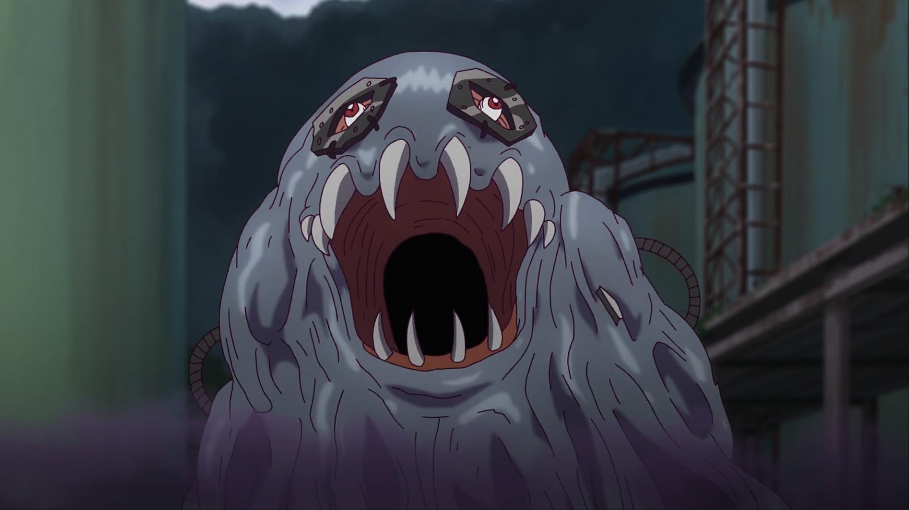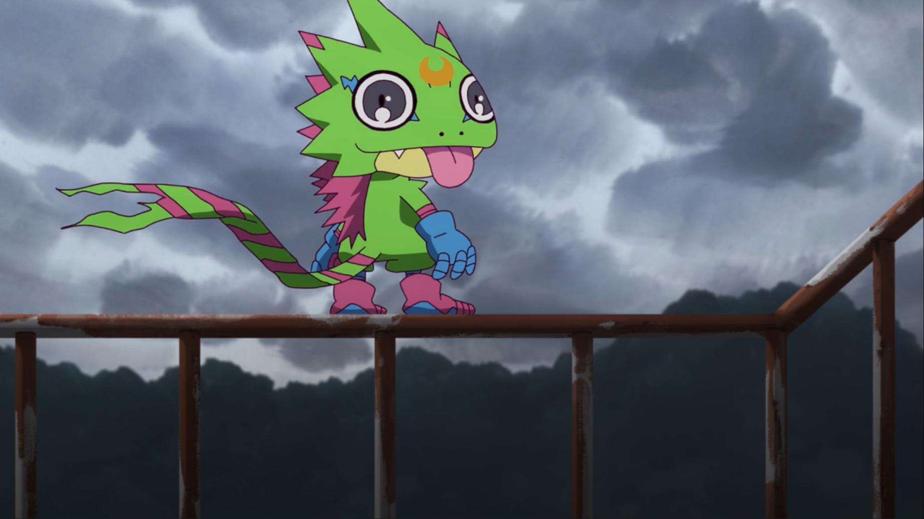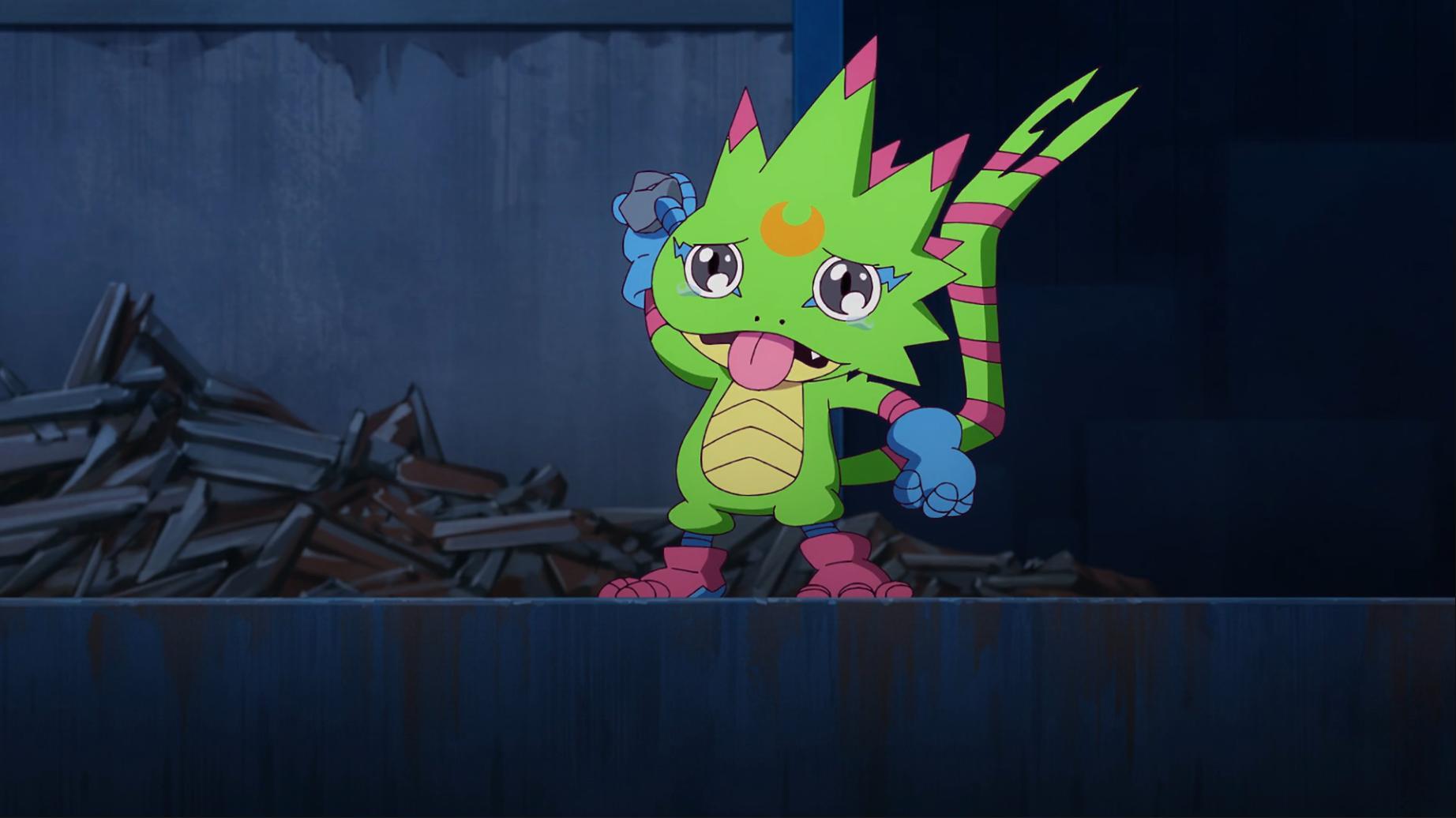 壁虎獸知道智郎這次是說真的 他拿起小石頭往河裡丟沒想到卻意外引出了巨大的爛泥獸 小歌當下被嚇一跳這裡會有數碼獸 她仔細看發現這隻爛泥獸比黃金鼻涕獸還噁心 吐槽怎麼每次都會遇到這種數碼獸啊...