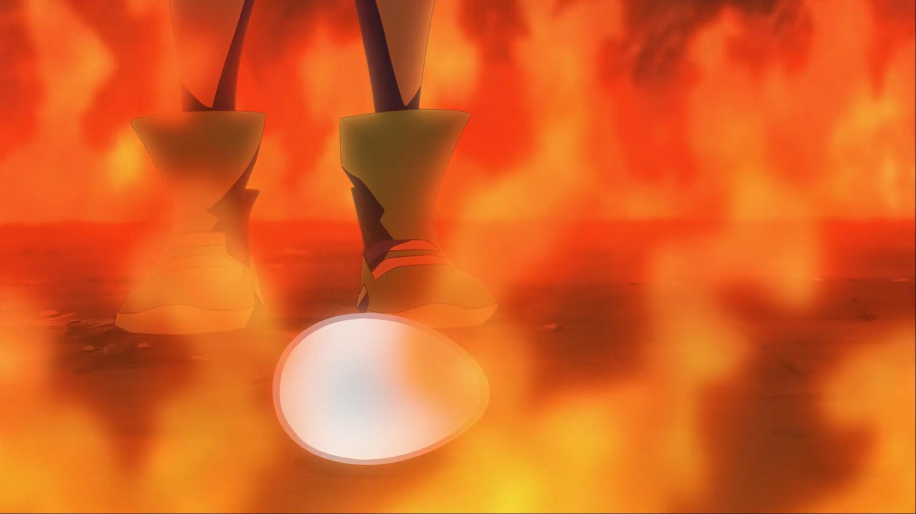 神秘男子在火焰中撿起一顆補助蛋說任務已經順利完成 看來代表火系的五行星已經先剷除掉某隻數碼獸了
