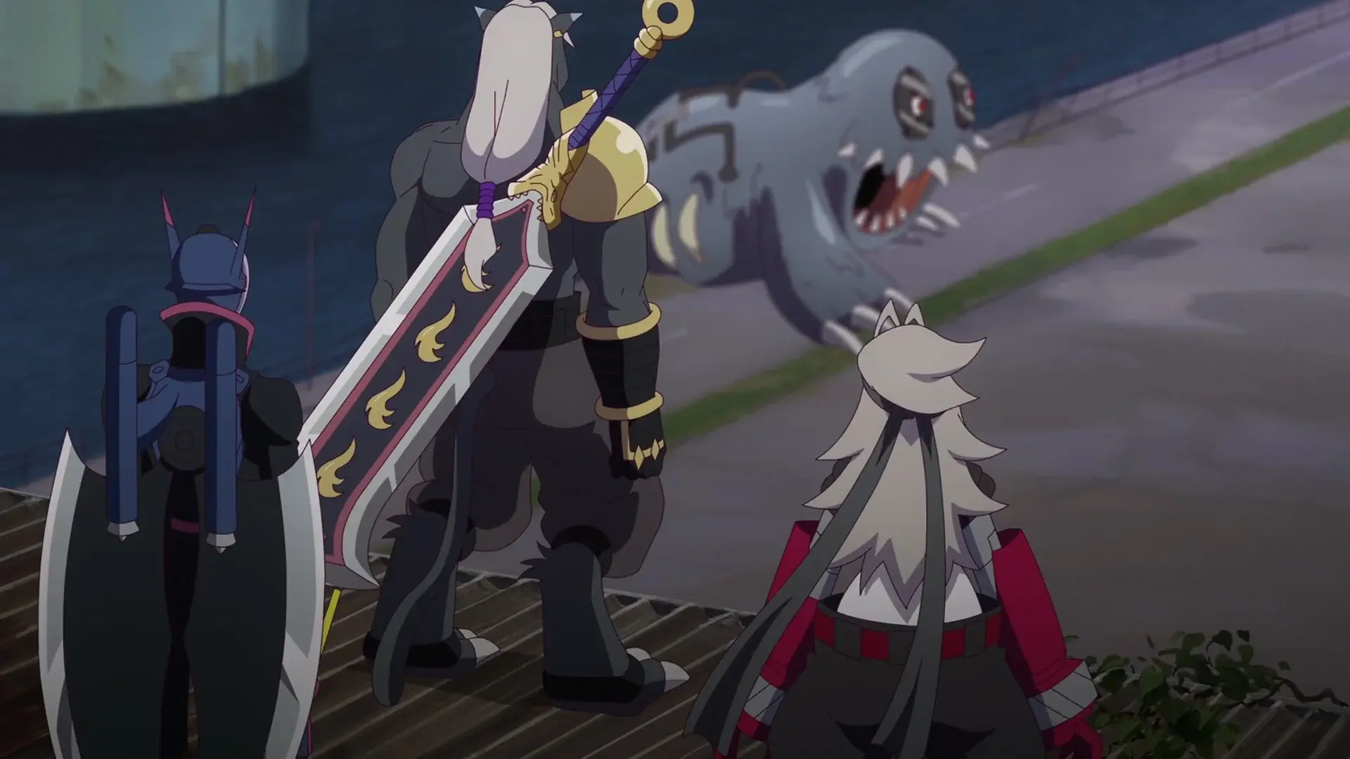 另一邊被智郎罵一頓的壁虎獸來到碼頭 小歌跑過來說智郎只是氣頭上才會說有點過分等等就會氣消了~