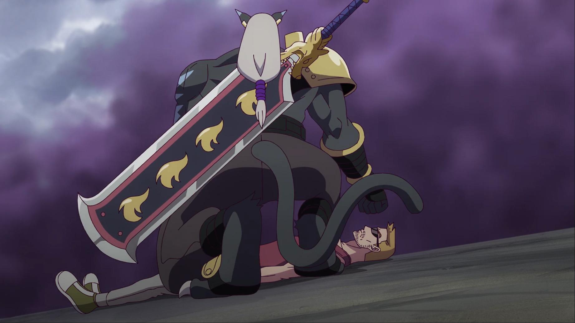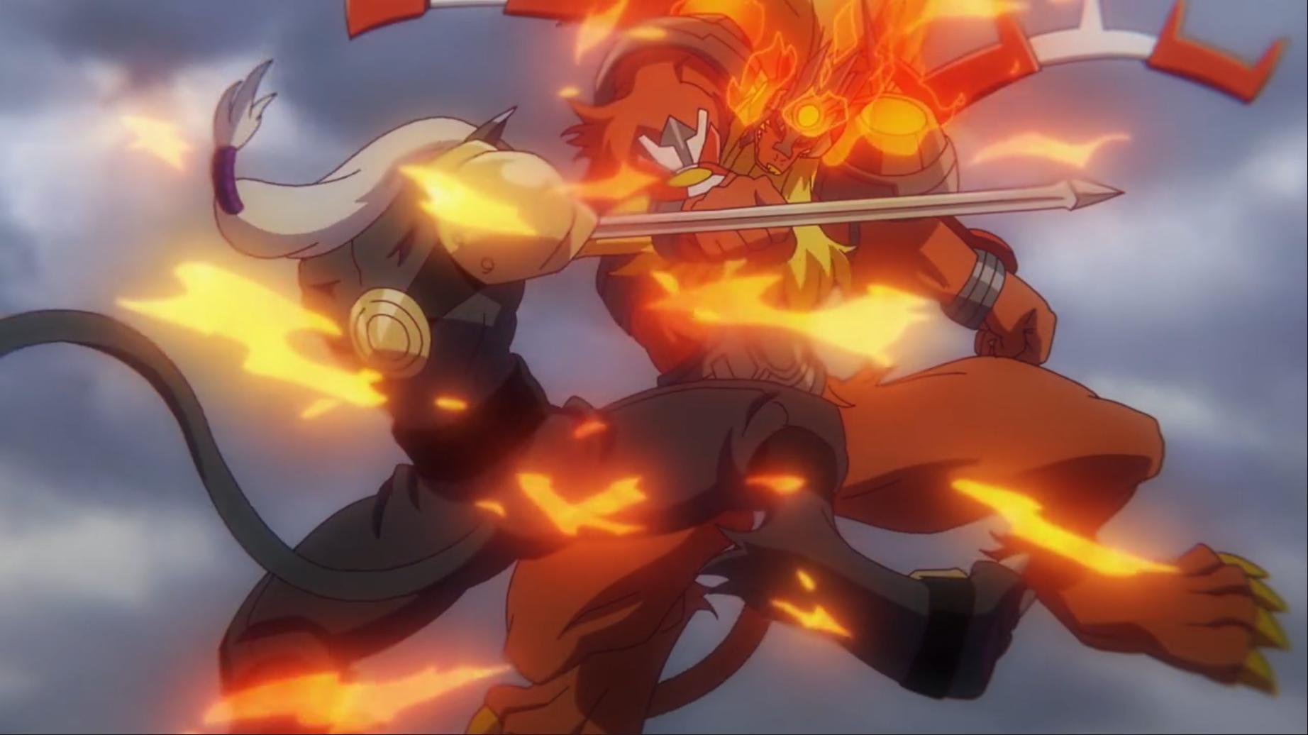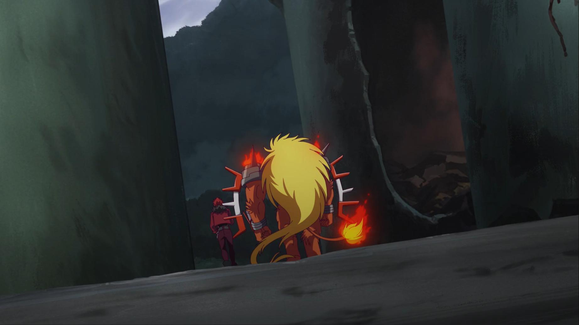 火焰一消失智郎發現倒地的壁虎獸馬上衝去查看 偶像天使也剛好醒來要去看壁虎獸狀況 這時從灰燼中走出一名男子將地上的補助蛋拿起來回收 火焰屬性五行星之一的忽那凱特和搭檔數碼獸耀獅獸初次登場 凱特一見到京大哥便先感嘆他那什麼樣子 智郎要去看壁虎獸狀況卻被凱特當場阻擋去路甚至故意絆倒他...