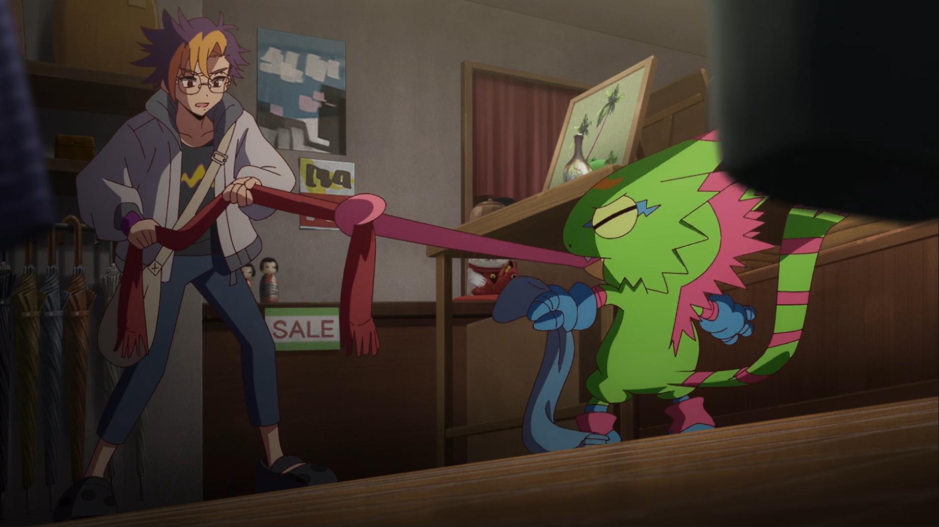 可是智郎根本沒聽到壁虎獸的話 壁虎獸隨即拿一條藍圍巾說這個不錯還用舌頭把智郎的紅圍巾搶過來...