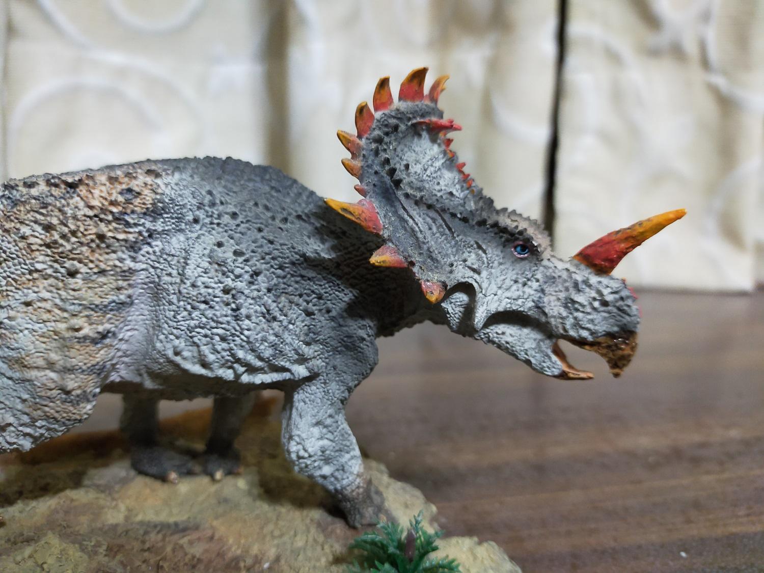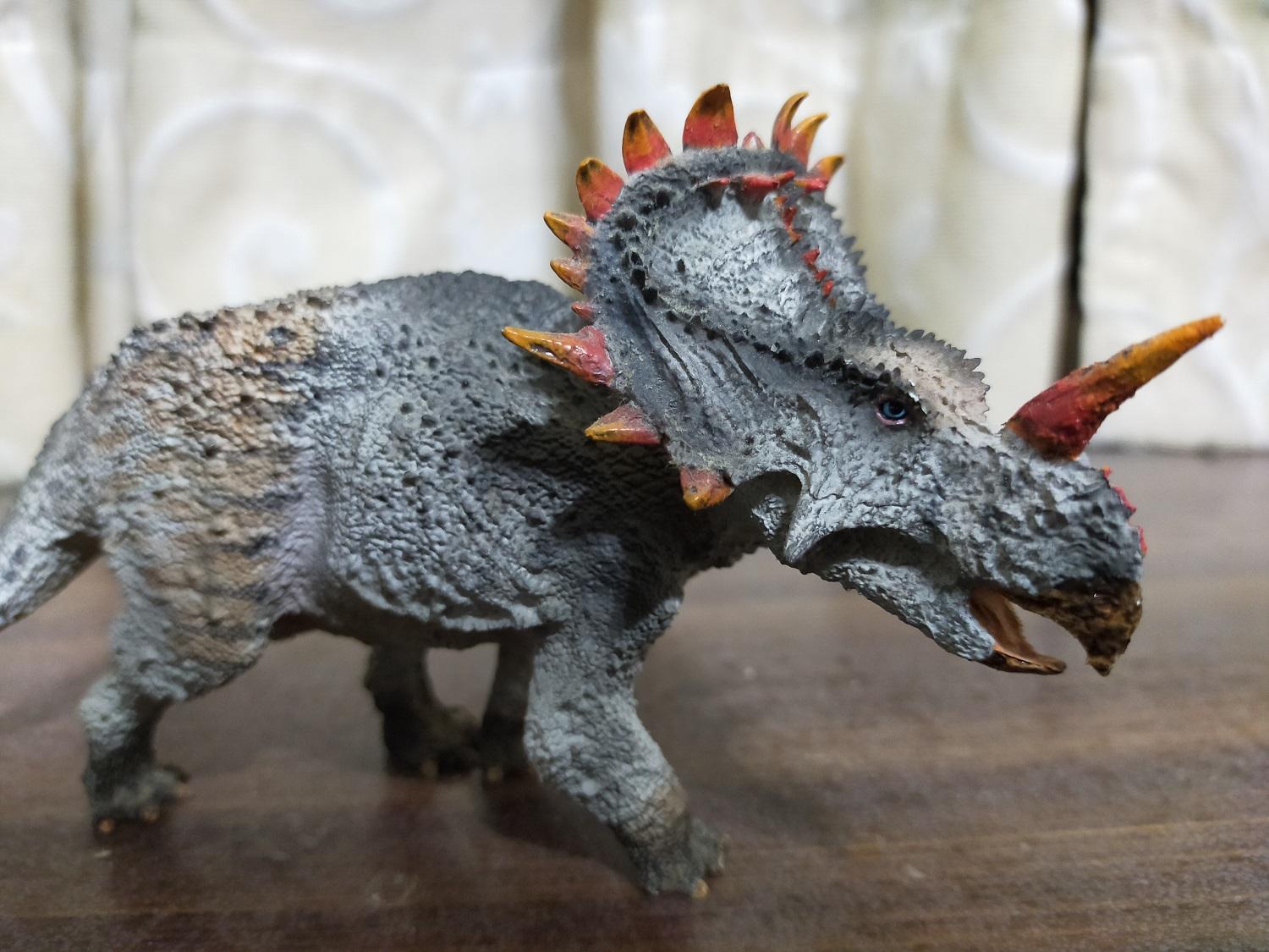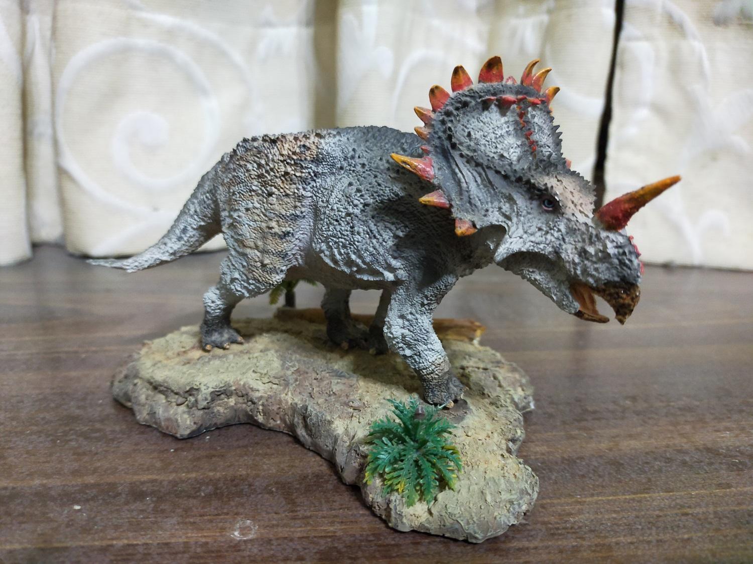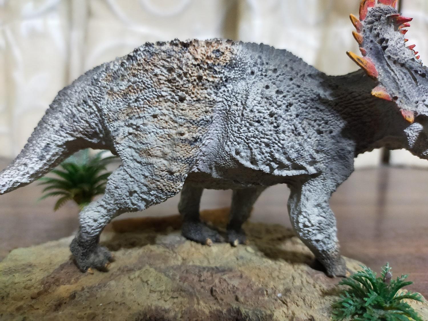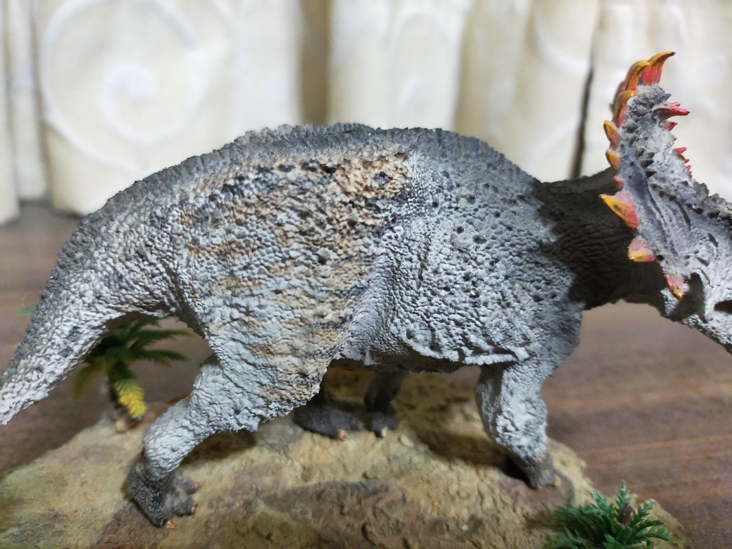 再來論建模品質的話,雷某覺得該款中國角龍的水準不僅略差於最初的巨獸龍,甚至連摸起來都會讓手感到些許不適,說明它並不適合長期拿在手中把玩(笑)