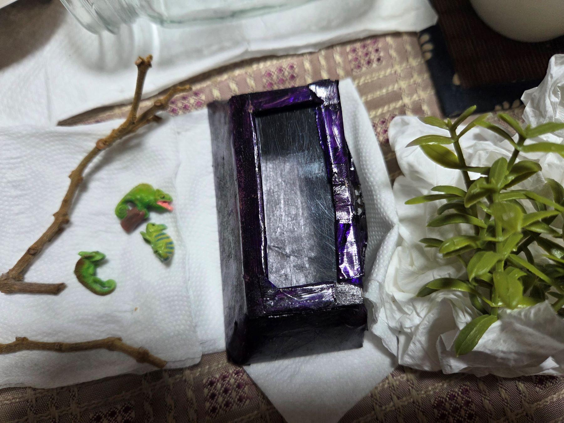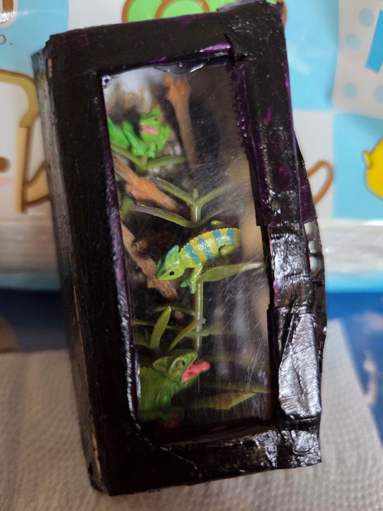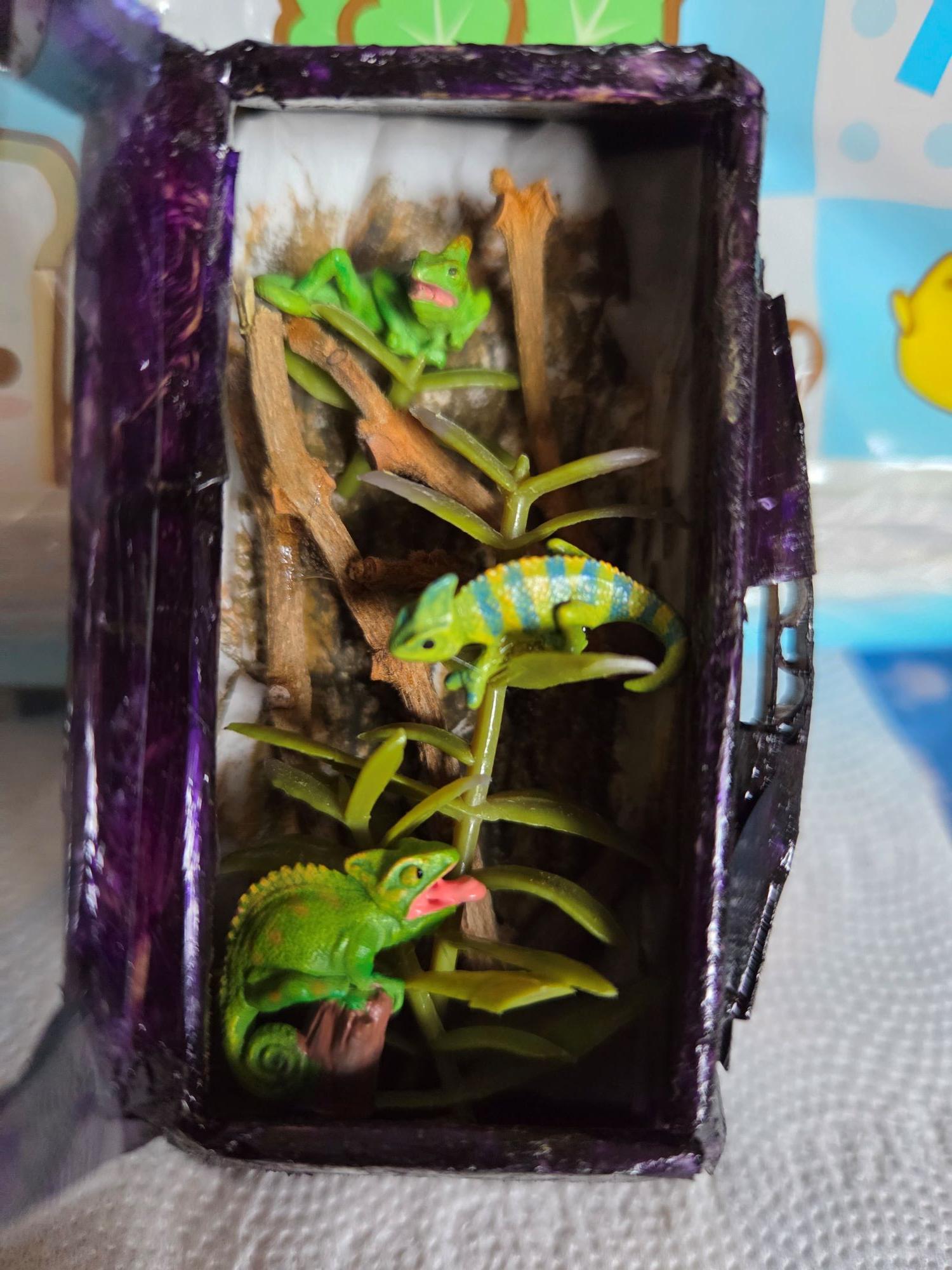 上次找到的變色龍模型會放進這個用厚紙板和塑膠片做成的壁掛式爬缸