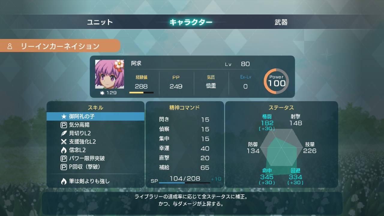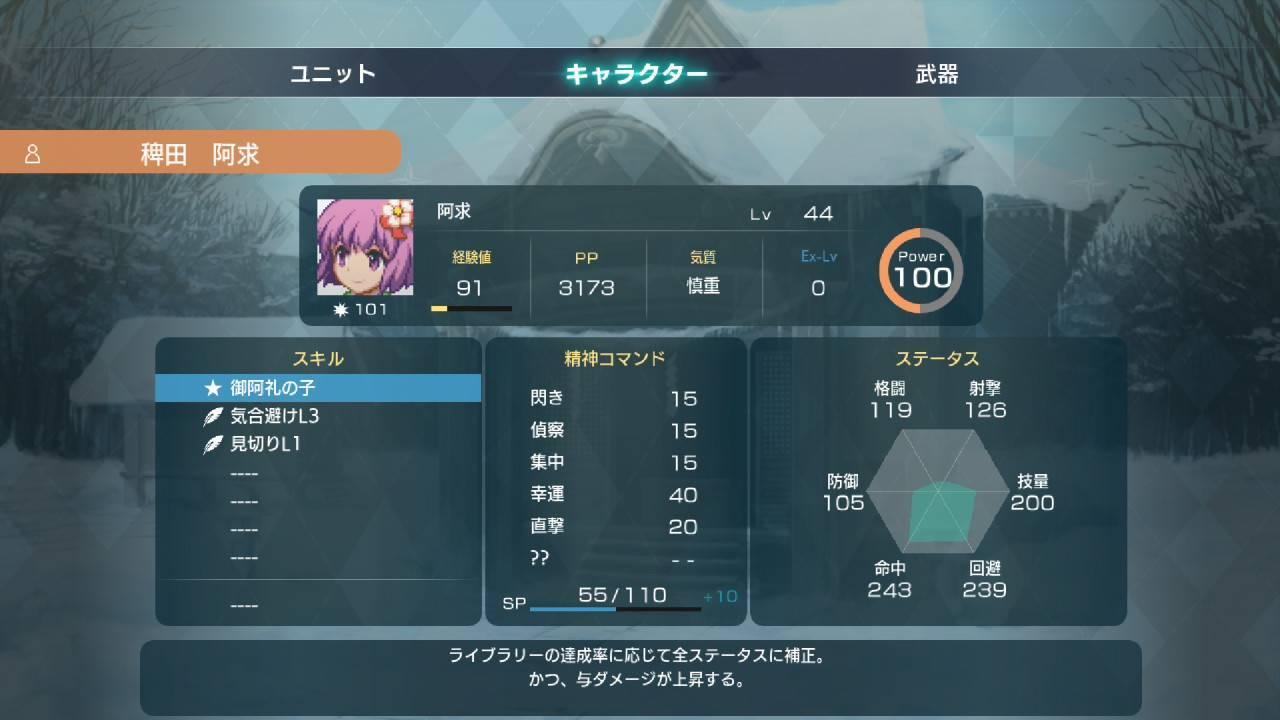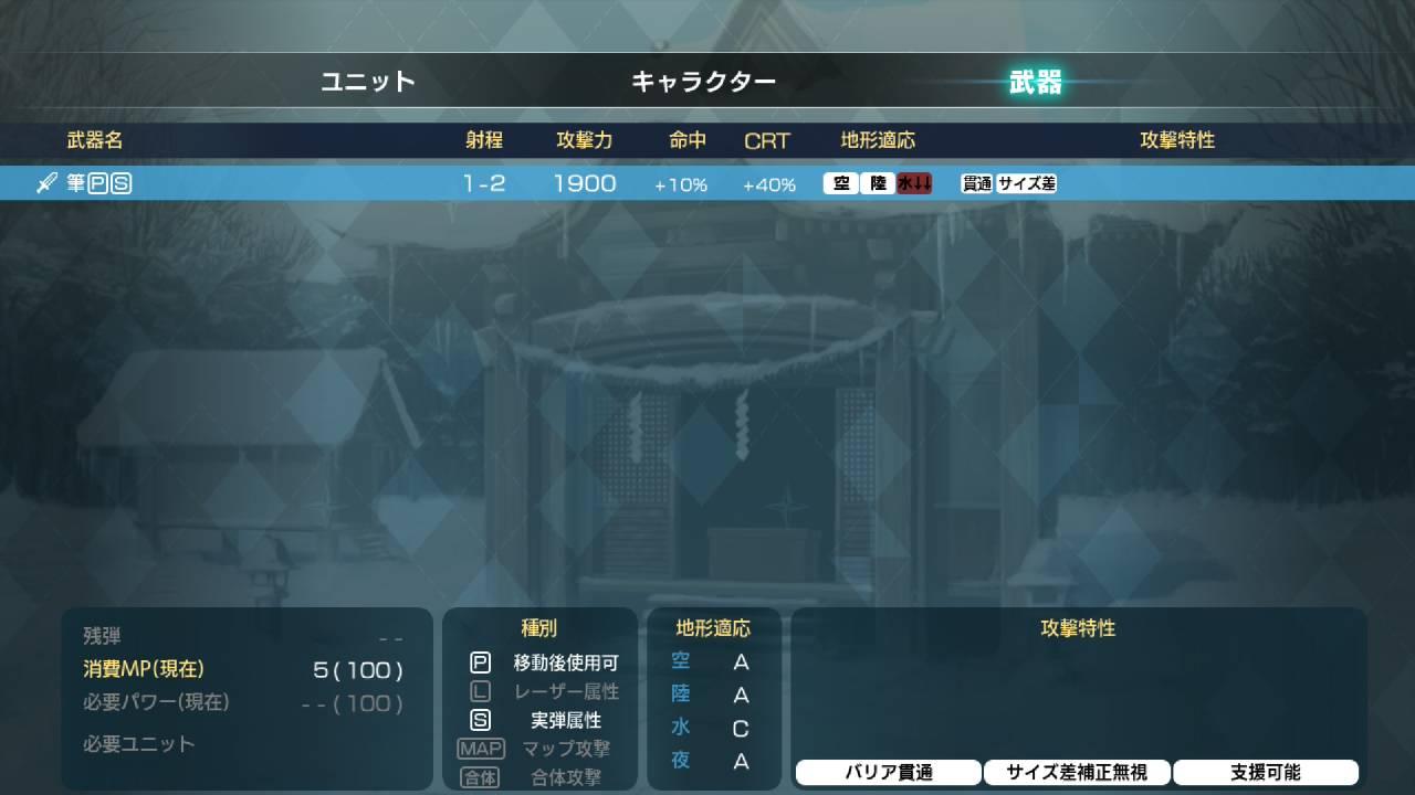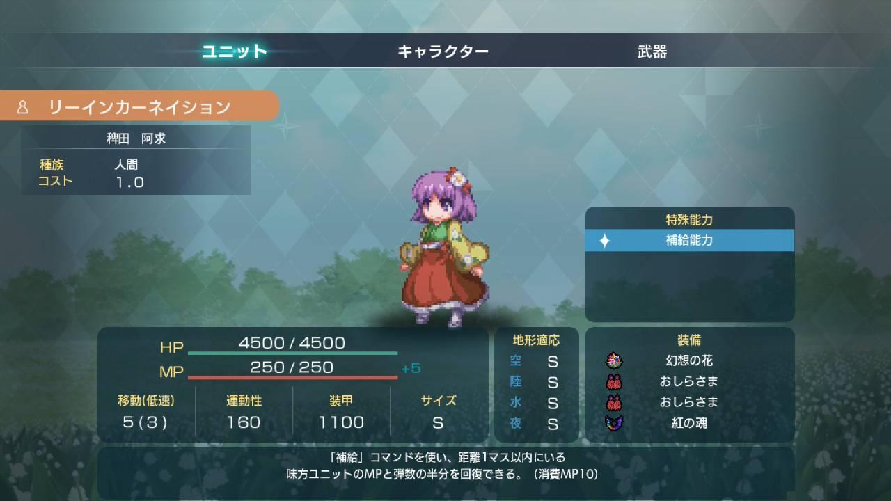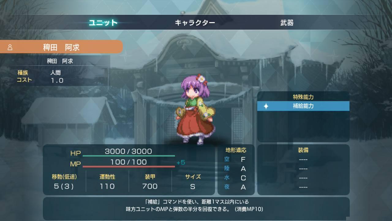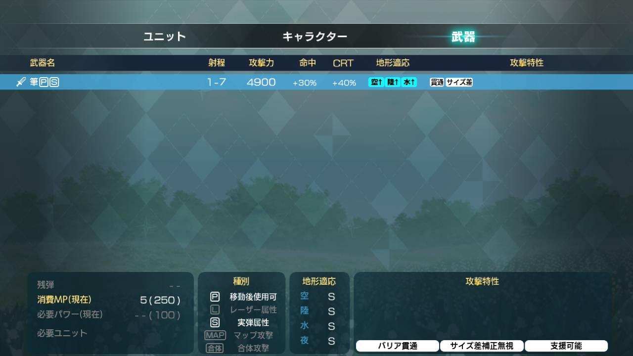 筆は剣より強し:攻擊「筆」的攻擊力+1000射程+5。一樣是強化阿求本身火力的技能,比妖怪博士L2更泛用,也不需要使用精神指令,算是最簡單好用的選擇。大推薦。