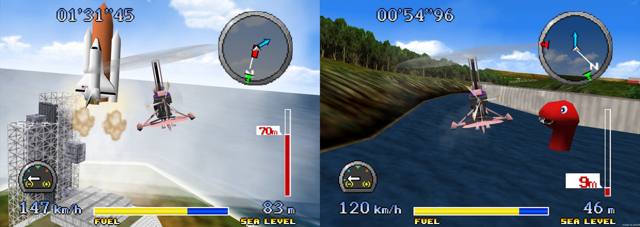 另外,遊戲中有六名角色,會有一些性能差異,例如飛行中的慣性強弱、風阻程度、轉彎角度等等。其中一位是波霸大姊,可惜 N64 貼圖的水準就...很醜,配音倒是不錯。