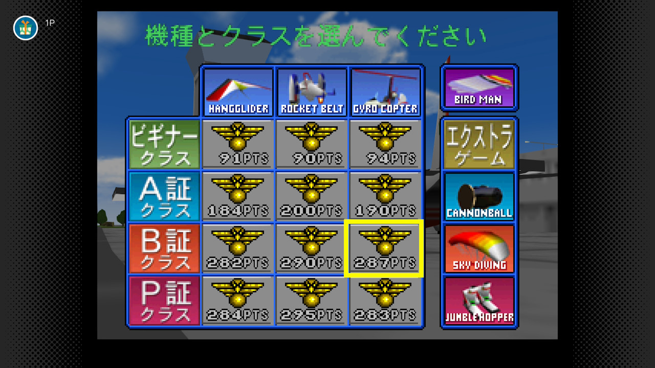 練習技術,考取飛行執照是遊戲的主要目標。三種飛行器各有初心者、B、A、Pilot 四個等級的測驗,透過測驗項目的達成率、完成時間、降落水準(落點與觸地力道)給予評分,再按分數區間拿獎牌:完美、金、銀、銅與不及格。