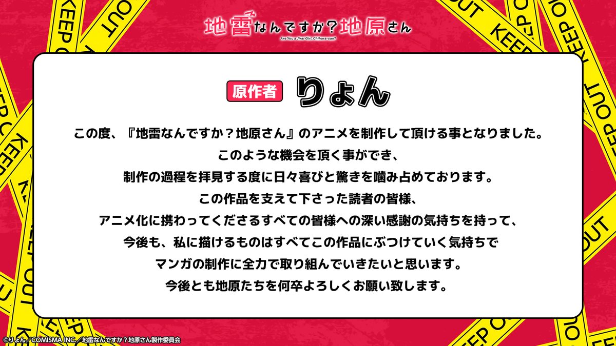 由 りょん 創作,於漫畫 APP「GANMA!」連載的漫畫作品《你是地雷系女子嗎?地原同學》(暫譯,地雷なんですか?地原さん),官方在今(25)日發表電視動畫化的消息。