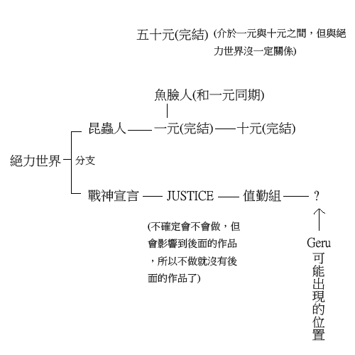 (我的設定寫說,前Geru劇情─管理者死後的IF世界有提到,新的能力不叫絕力了,而是叫做"藍力",且當初要畫成漫畫的警察系列JUSTICE也只畫一篇就沒有下文了...)