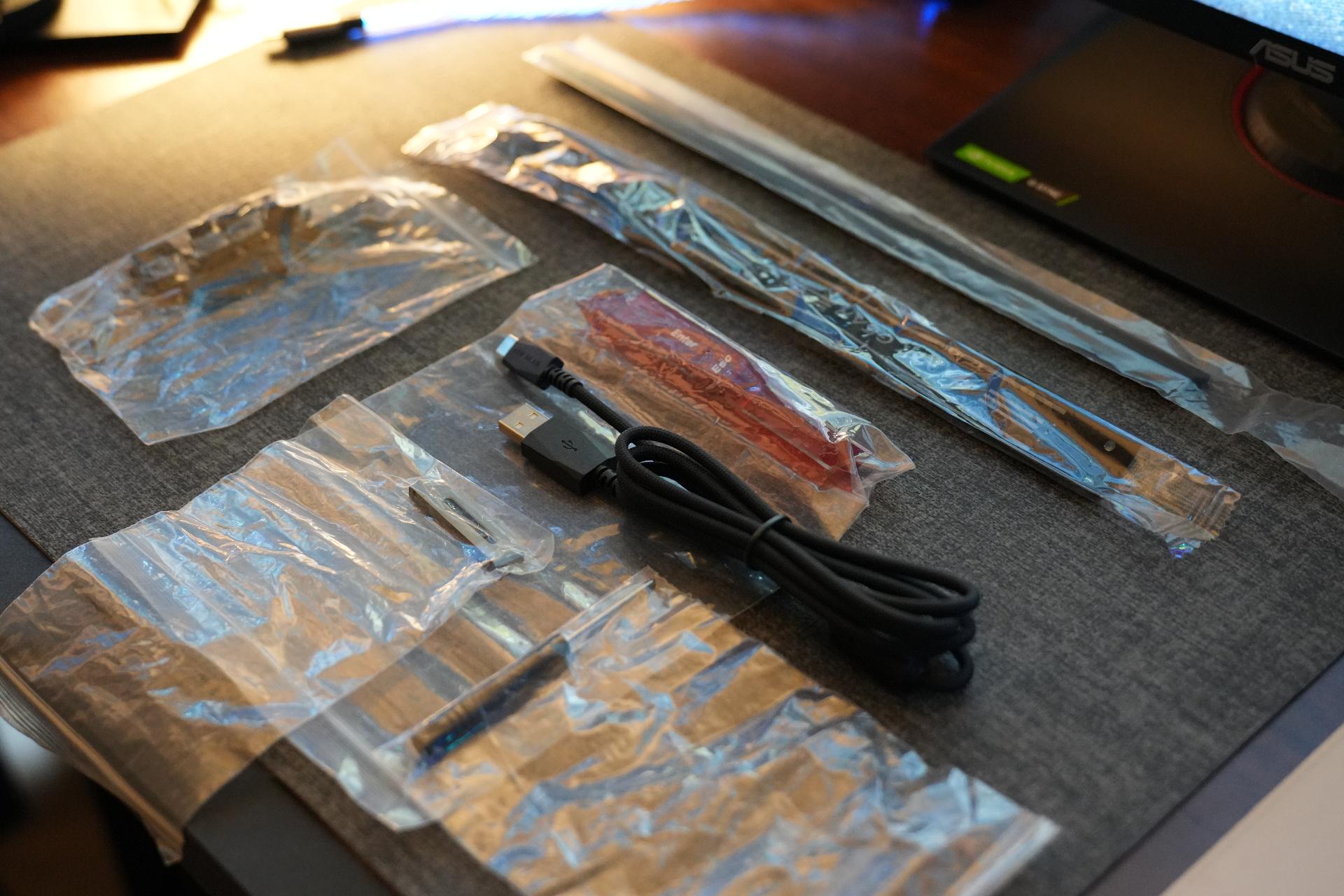 鋁合金替換手托 , 飄帶與飄帶更換扣, 部分替換鍵帽 , 傳輸線 , 備用替換軸體 , 螺絲起子