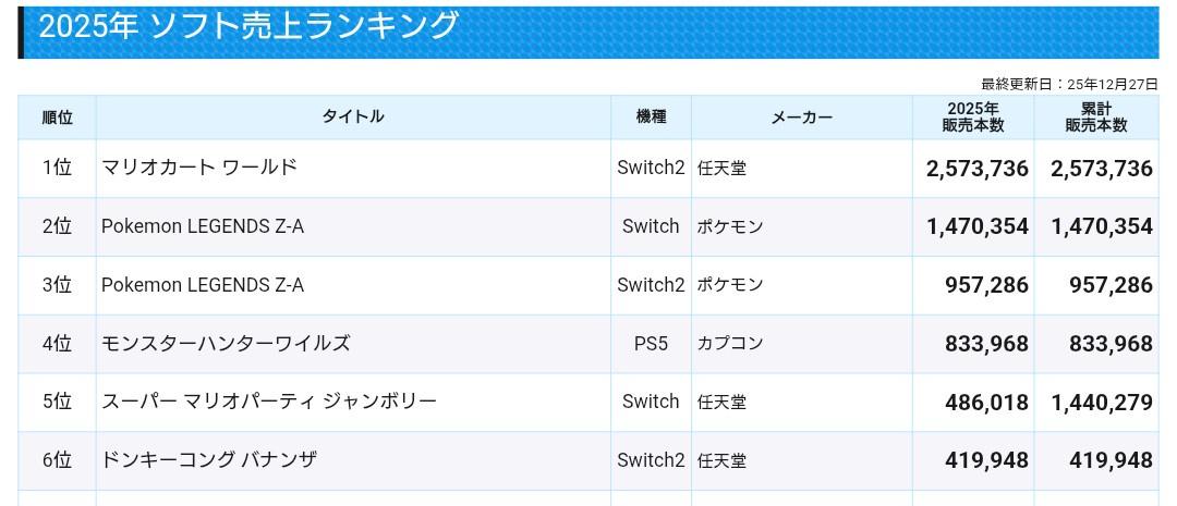 2025年最終日なので今年のゲーム国内売上貼っておくか