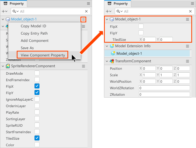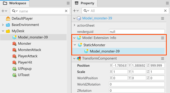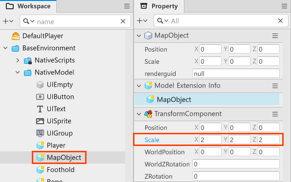 在模型或實體的屬性編輯器最上面顯示的是不屬於任何元件的屬性,是屬於模型屬性。模型屬性就像是書籤一樣,包含了屬於模型或實體裡元件的屬性模名屬性是元件屬性的投影,如果修改模型屬性,對應的屬性也會一併被修改。假設你修改了Scale值-Object-1實體的模型屬性之一-改為x=10, y=10, z=10,你會看到TransformComponent裡的Scale值也會一起更動。