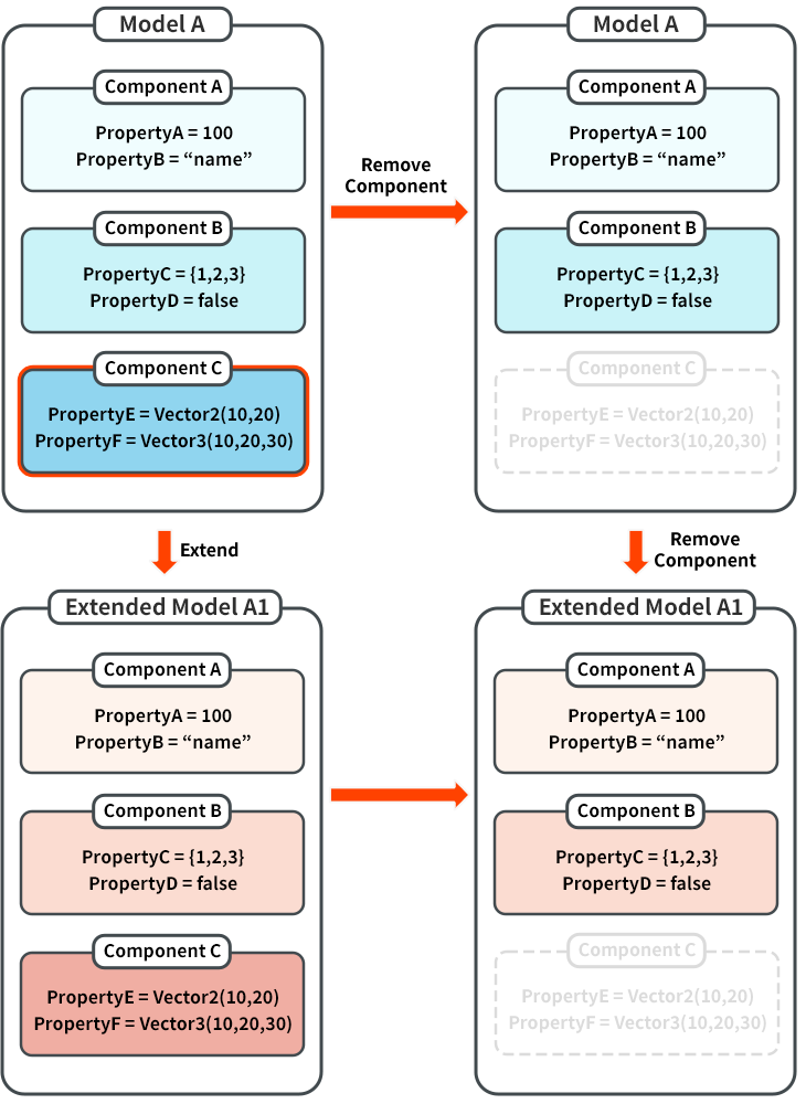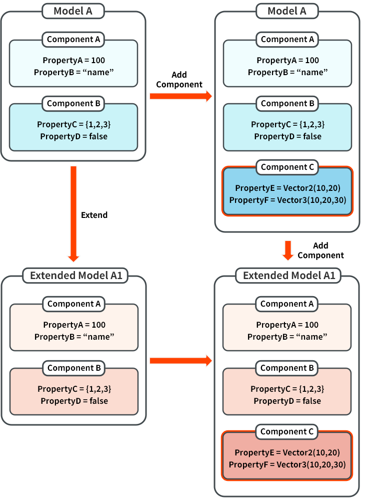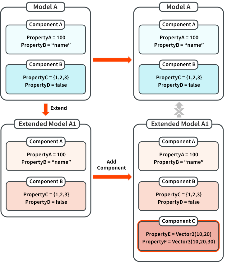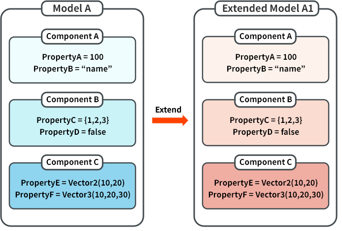 子模型的元件及屬性預設值皆來自其父模型。舉例來說,模型A包含元件A、元件B、元件C,A1模型為子模型,同樣也會包含元件A、元件B、元件C,其屬性設定初始值會與父模型A相同。