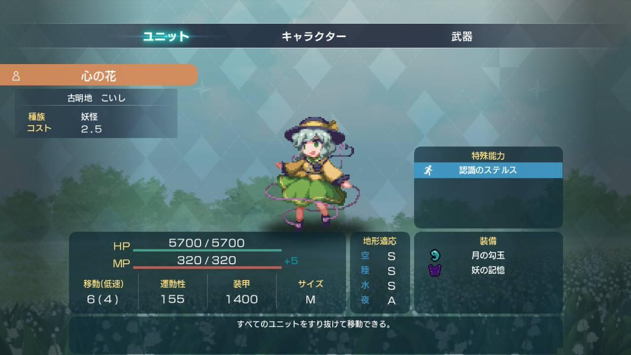 こいし的読心只有Lv1,因此迴避上與古さとり會有段差距,但每回合初始的「閃き」還是有的