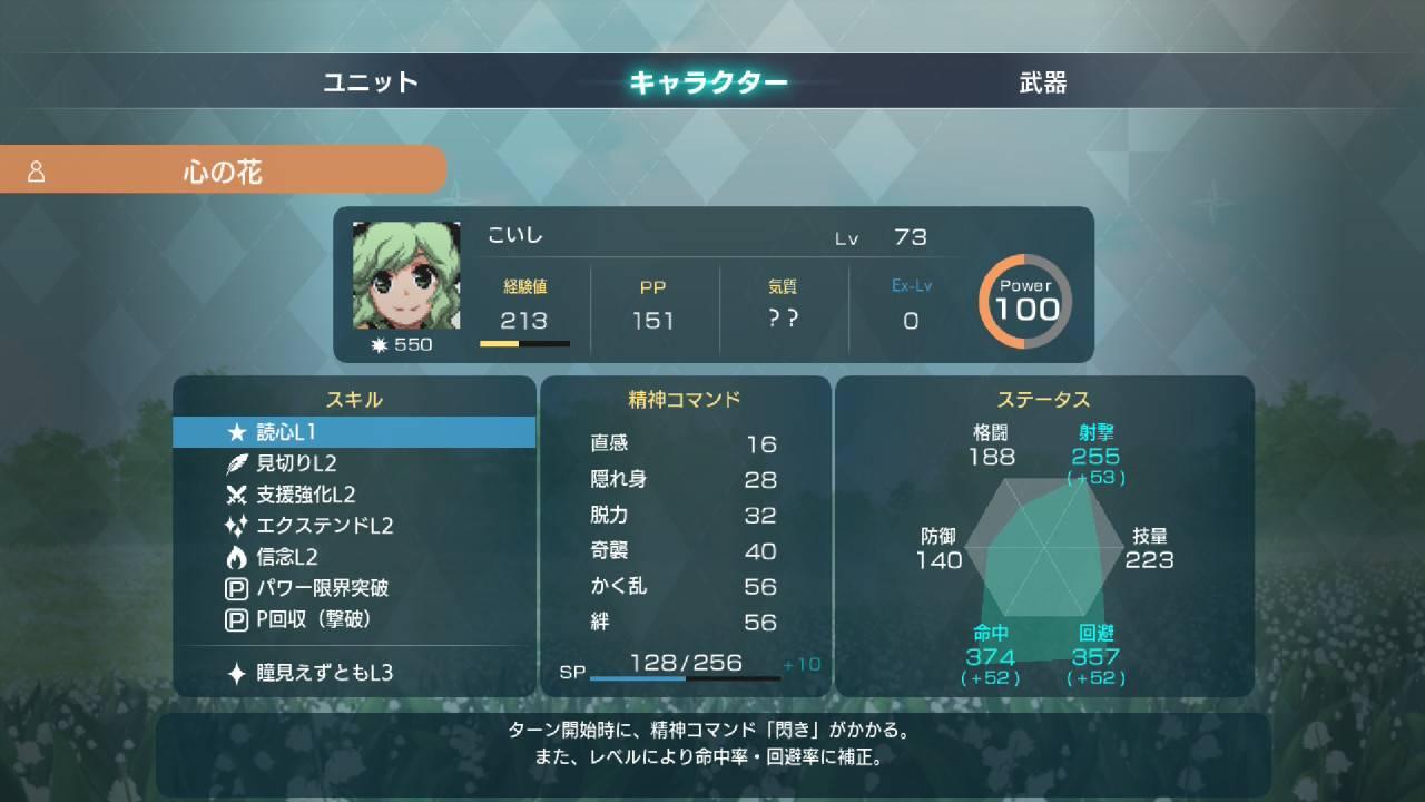 瞳見えずとも:依技能等級,與「古明地さとり」同隊或鄰近時,相互給予命中率與迴避率的補正。如字面所述,只要接近「古明地さとり」就可以強化命中迴避率的技能,並且與さとり協同的最強技射程+1。大推薦。大推薦。