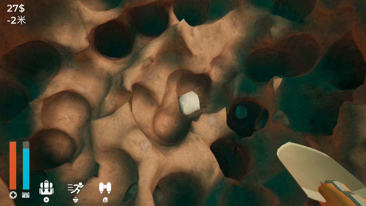 鏟子會耗電,三不五時就得回到倉庫充電。挖掘的過程,會陸續出現越來越值錢的礦脈:石頭、煤、鐵、銅、銀、金、白金與鑽石;挖到的東西會自動往背包裡放,滿了回倉庫賣,賺到錢可以升級鏟子、背包容量、電池與噴射背包。