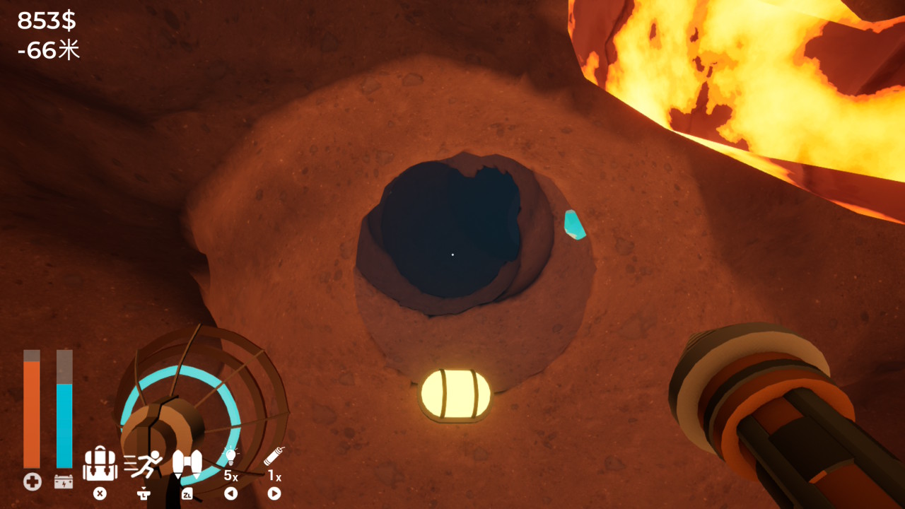 挖得越深,周遭越暗,也需要買一下礦燈用以照明。遊戲本身僅有音效,挖到逐漸伸手不見五指的時候,會有一點毛毛的,尤其是忽然出現莫名其妙的工整坑洞。