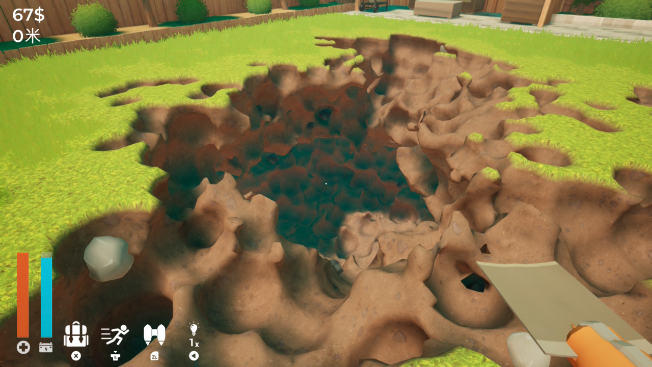 第一人稱視角,拿著鏟子在屋子後院開挖,一下一個坑,坑慢慢地聚成了洞,形成歪七扭八的地穴。深掘其中,找尋寶藏後,是本作的破關目標;簡單說就是自己挖洞自己跳啦。
