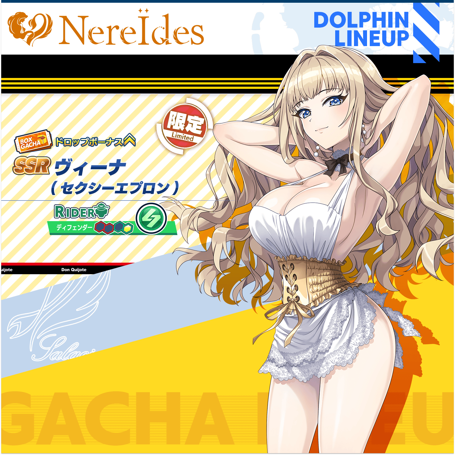本次 PU 的新聯名海豚為 SSR 薇娜(性感圍裙) ヴィーナ(セクシーエプロン) 。※本卡池新衣裝為期間限定十連抽,第 10 抽必定為「薇娜(性感圍裙)」,限使用購買的蒼洋石進行抽卡,限抽 1 次;獲得的「薇娜(性感圍裙)」已經是 Lv.80、最大覺醒