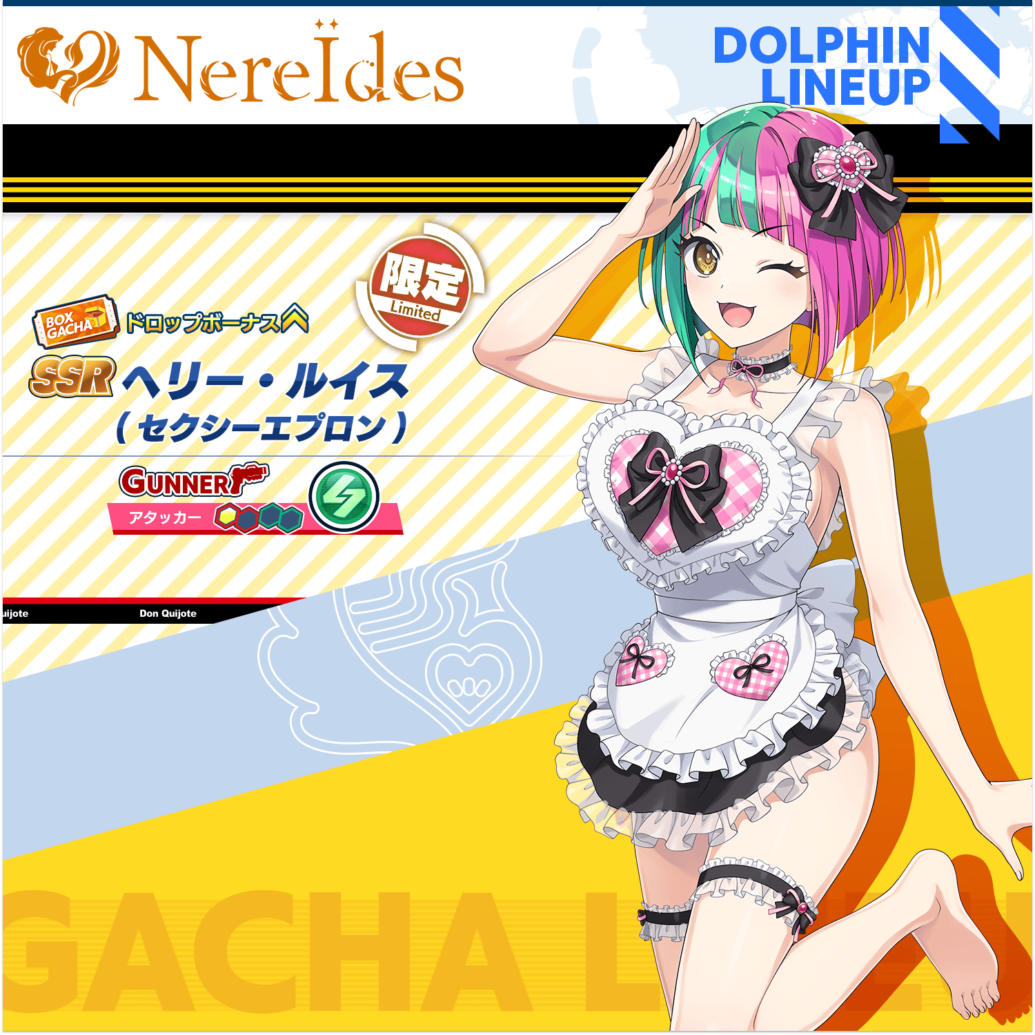 本次 PU 的新聯名海豚為 SSR 海莉・露易絲(性感圍裙) ヘリー・ルイス(セクシーエプロン) 。※本卡池新衣裝為期間限定十連抽,第 10 抽必定為「海莉・露易絲(性感圍裙)」,限使用購買的蒼洋石進行抽卡,限抽 1 次;獲得的「海莉・露易絲(性感圍裙)」已經是 Lv.80、最大覺醒