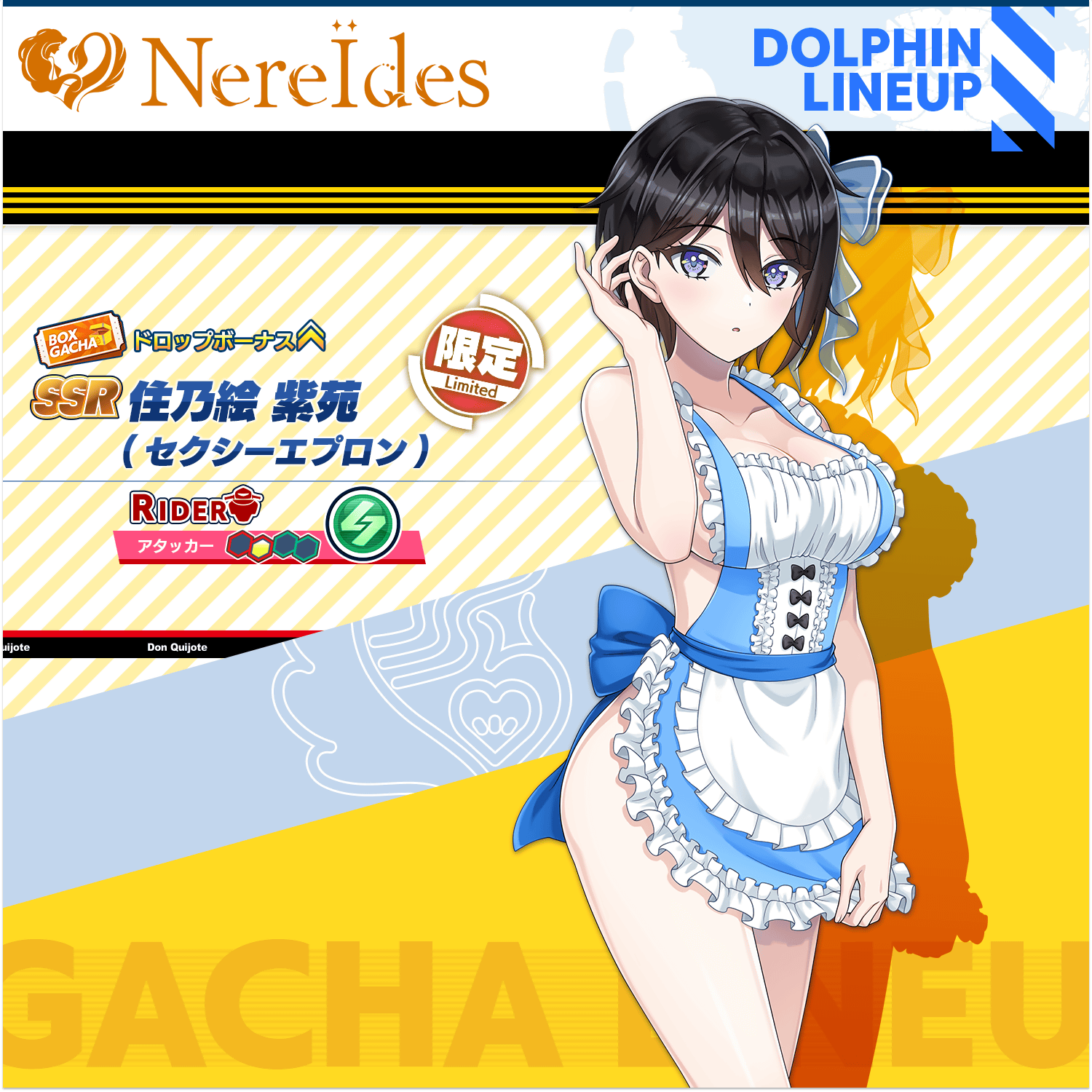 本次 PU 的新聯名海豚為 SSR 住乃繪紫苑(性感圍裙) 住乃絵紫苑(セクシーエプロン) 。※本卡池新衣裝為期間限定十連抽,第 10 抽必定為「住乃繪紫苑(性感圍裙)」,限使用購買的蒼洋石進行抽卡,限抽 1 次;獲得的「住乃繪紫苑(性感圍裙)」已經是 Lv.80、最大覺醒