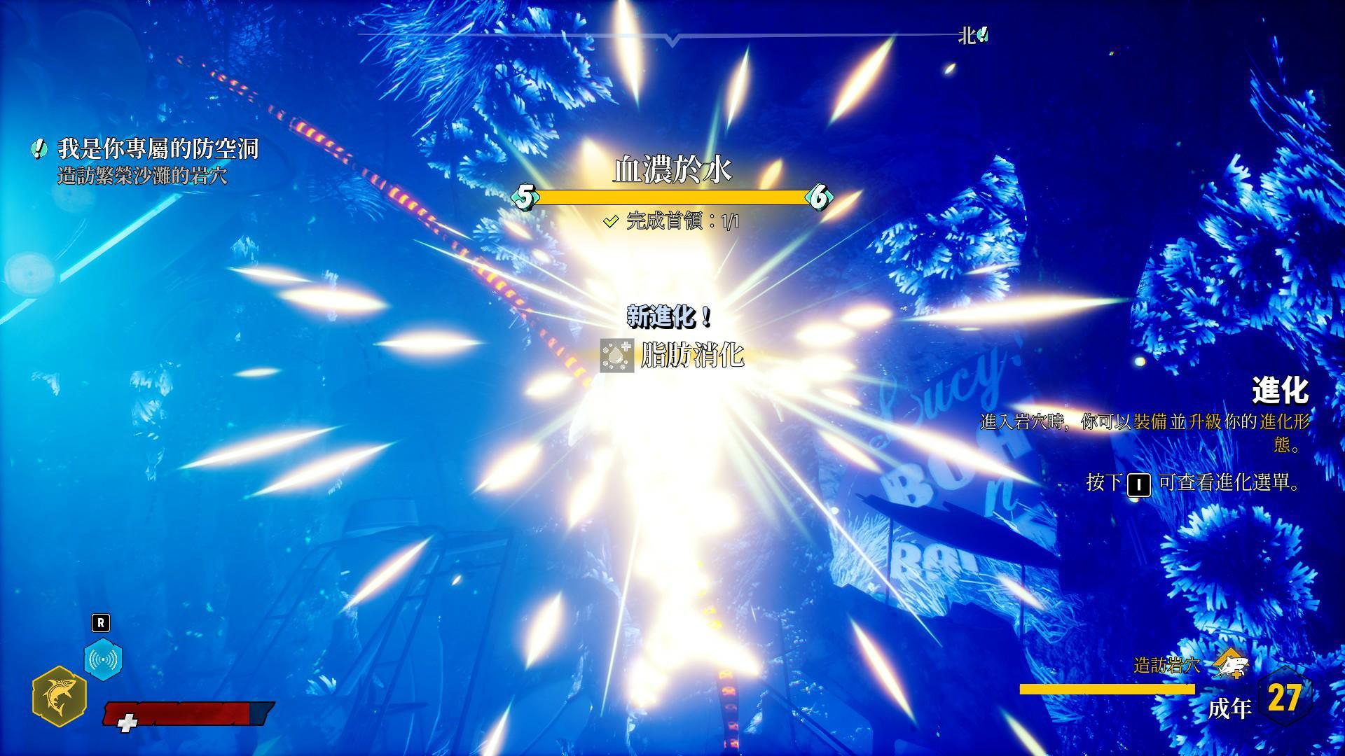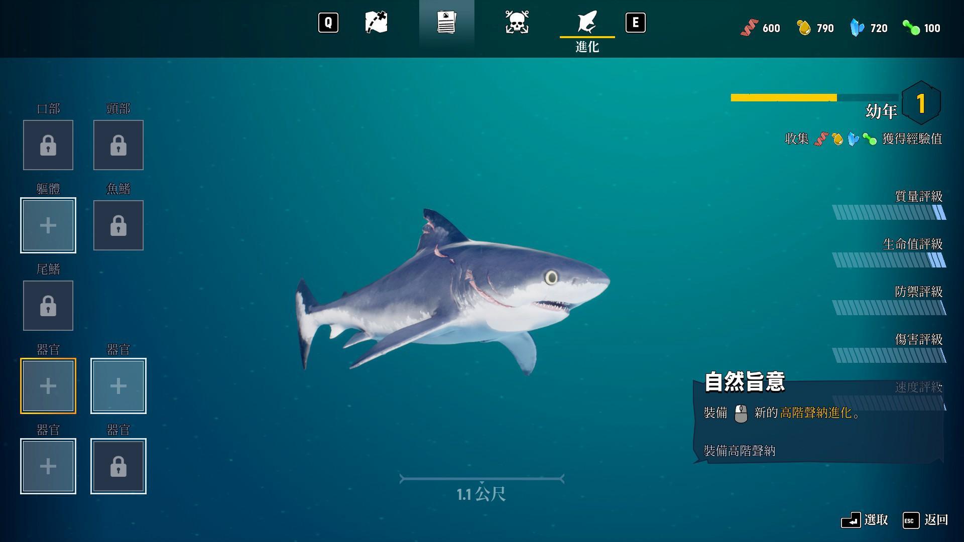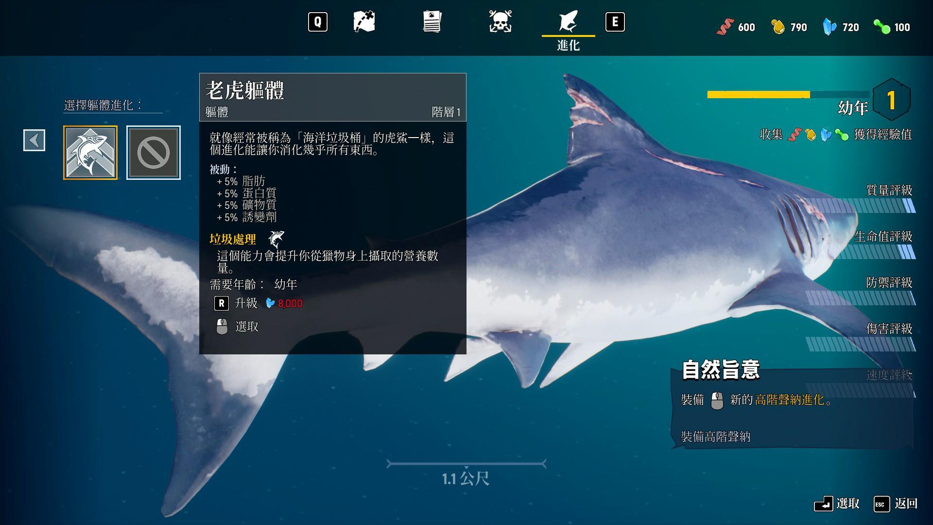 升級後會增加身體各項數值,讓玩家操作的鯊魚角色越來越強大