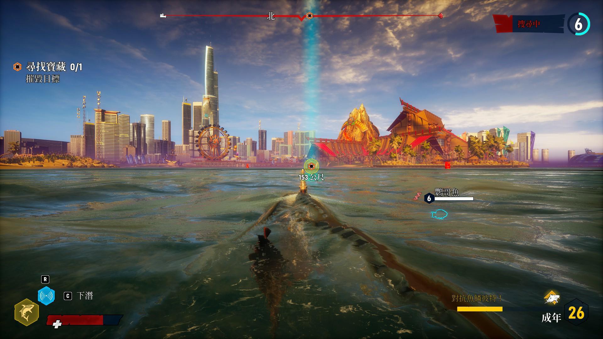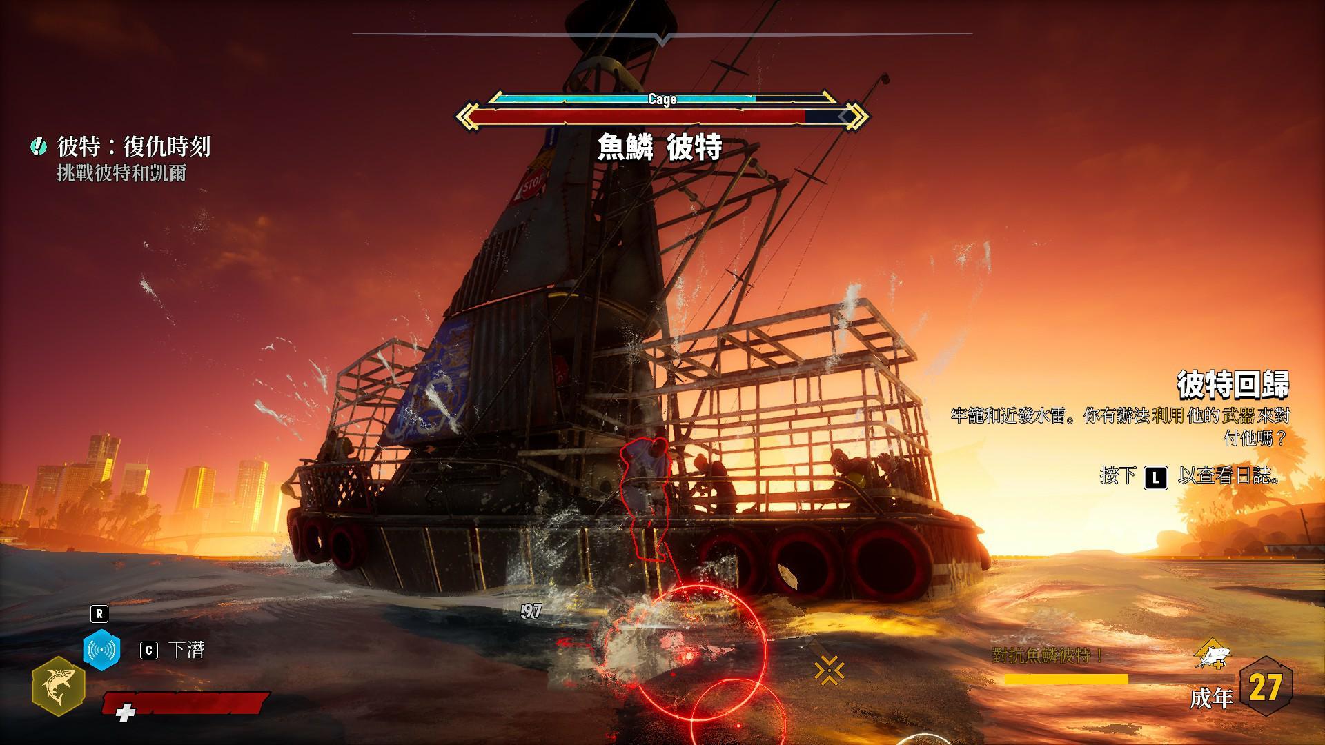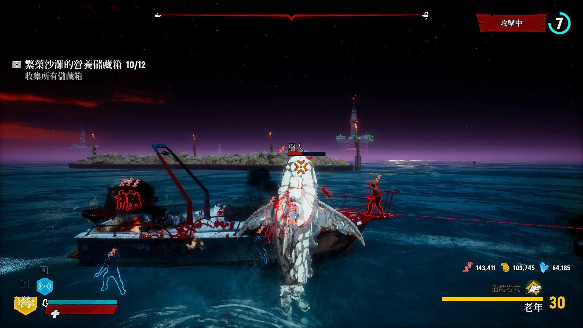 要把人類小BOSS們引出來,就要先把普通的賞金獵人們找過來,可以去岸上攻擊人類或是把人類的船隻給破壞掉、把人類吃掉,右上角的威脅值就會增加,橫條的威脅值滿了之後賞金獵人就會紛紛跑出來追捕玩家