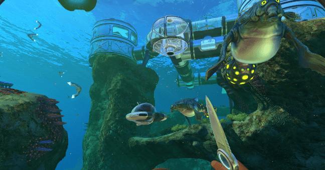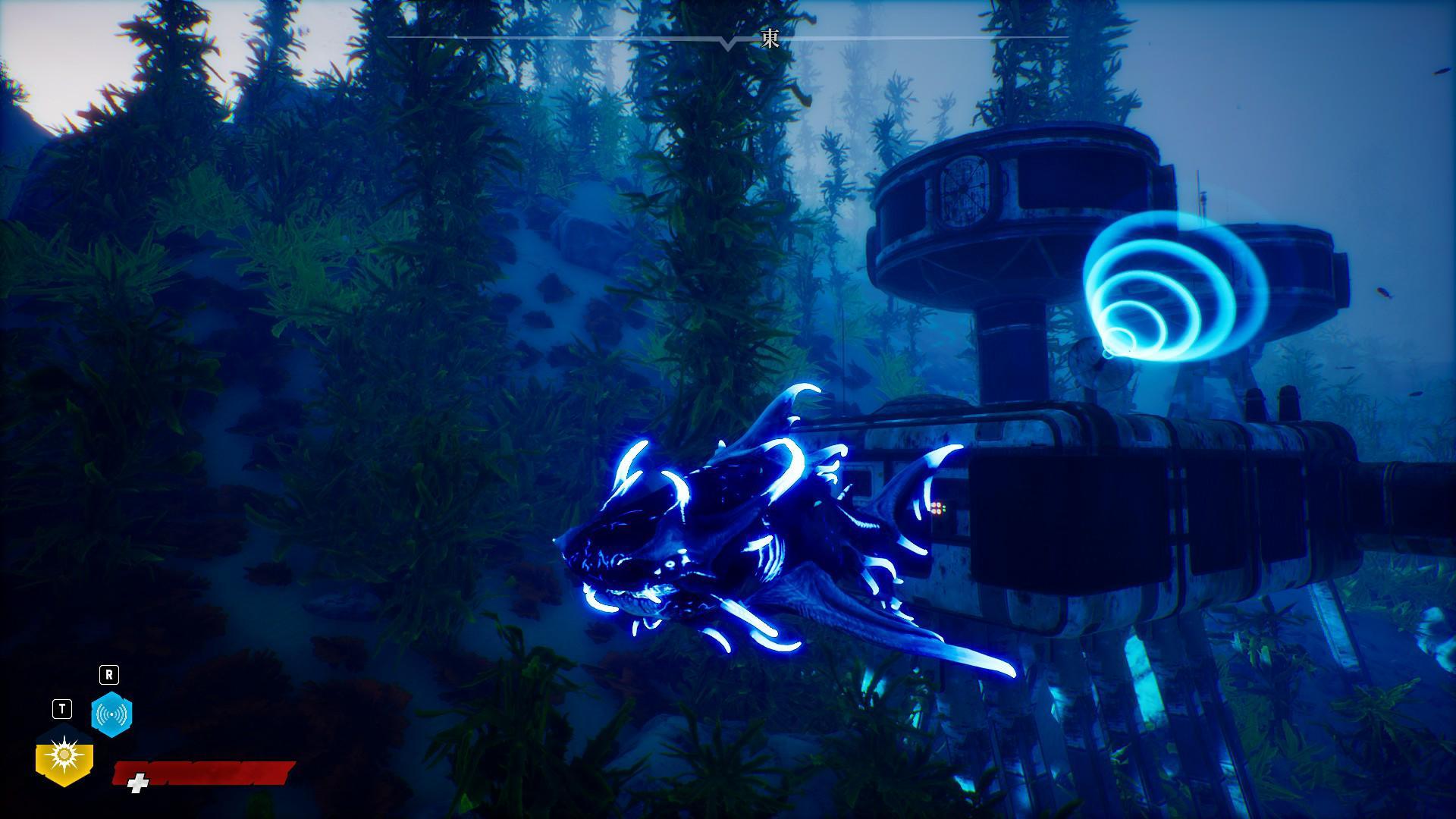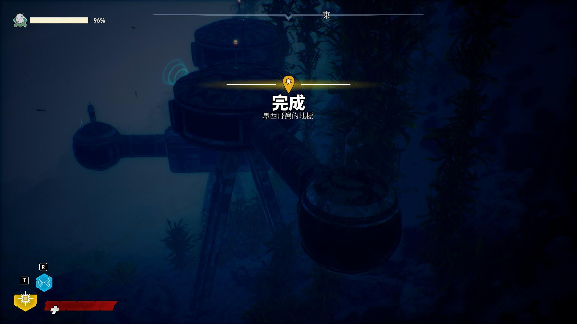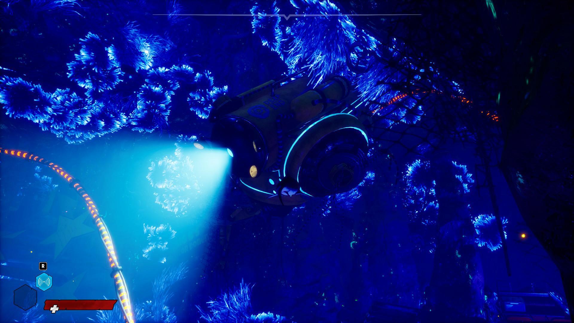 線連接的是壞掉的潛水艇,唯一還能用的潛水艇燈給玩家提供了光線,讓玩家可以看到岩洞裡漂亮的風景設計