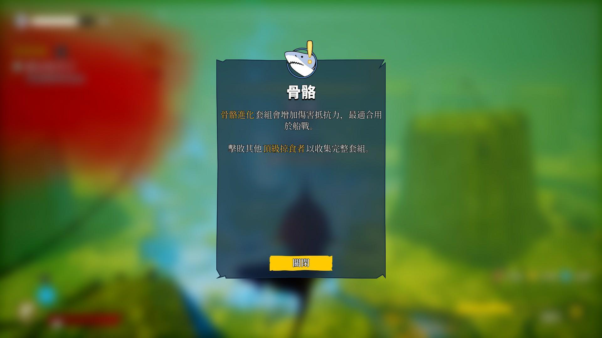 骨骼套裝就是所謂坦克+近戰套裝,通常用在與人類的獵鯊團戰鬥時會超級好用!硬到不用一直潛下去吃其他魚來補血,可以一直打一直爽!