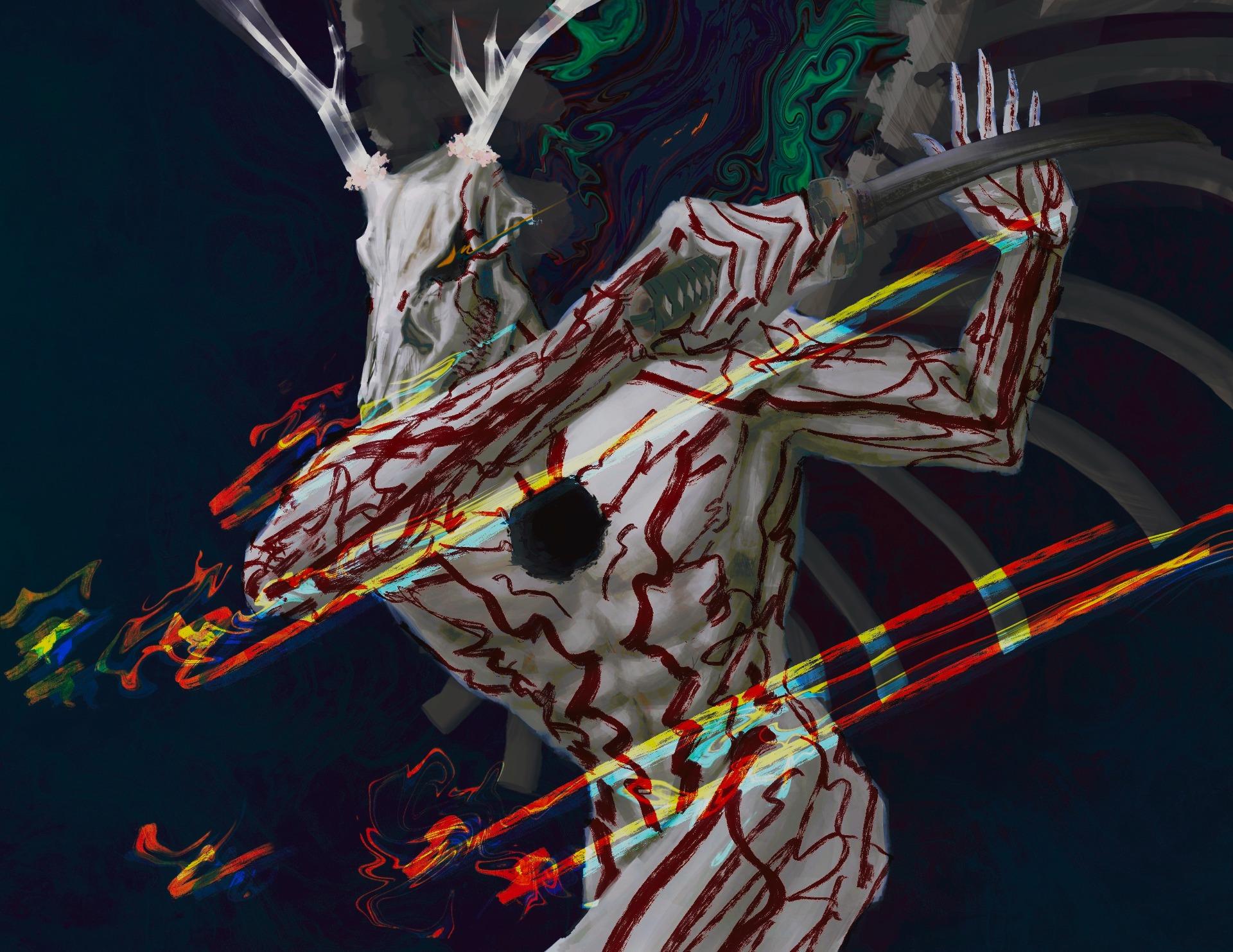 面具額角處的鹿角如同生長不斷的白色晶體,向天空無限延伸,並在過程中就好像樹枝一樣分岔出無數分枝……