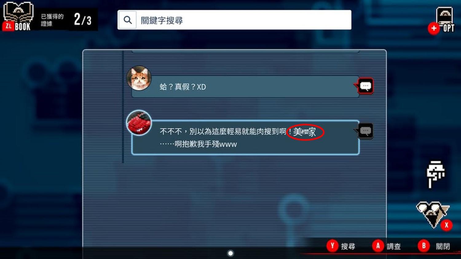 遇到回覆有「跳動文字」時,戴上眼鏡會獲得「關鍵字」,利用關鍵字搜尋則會獲得更多文章,有時1個關鍵字會無法取得結果,就必須得使用2個來做搜尋,取得一定數量的關鍵情報後就算過關