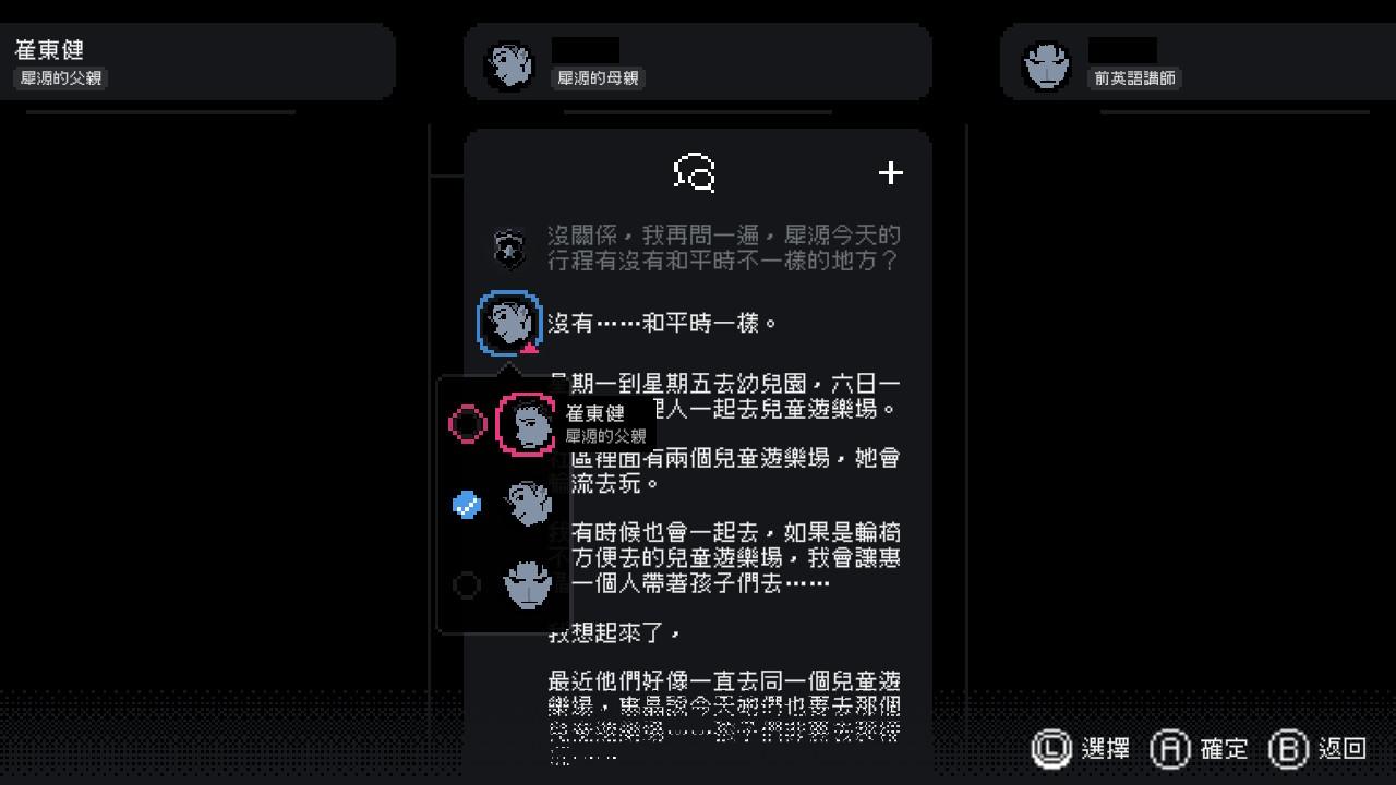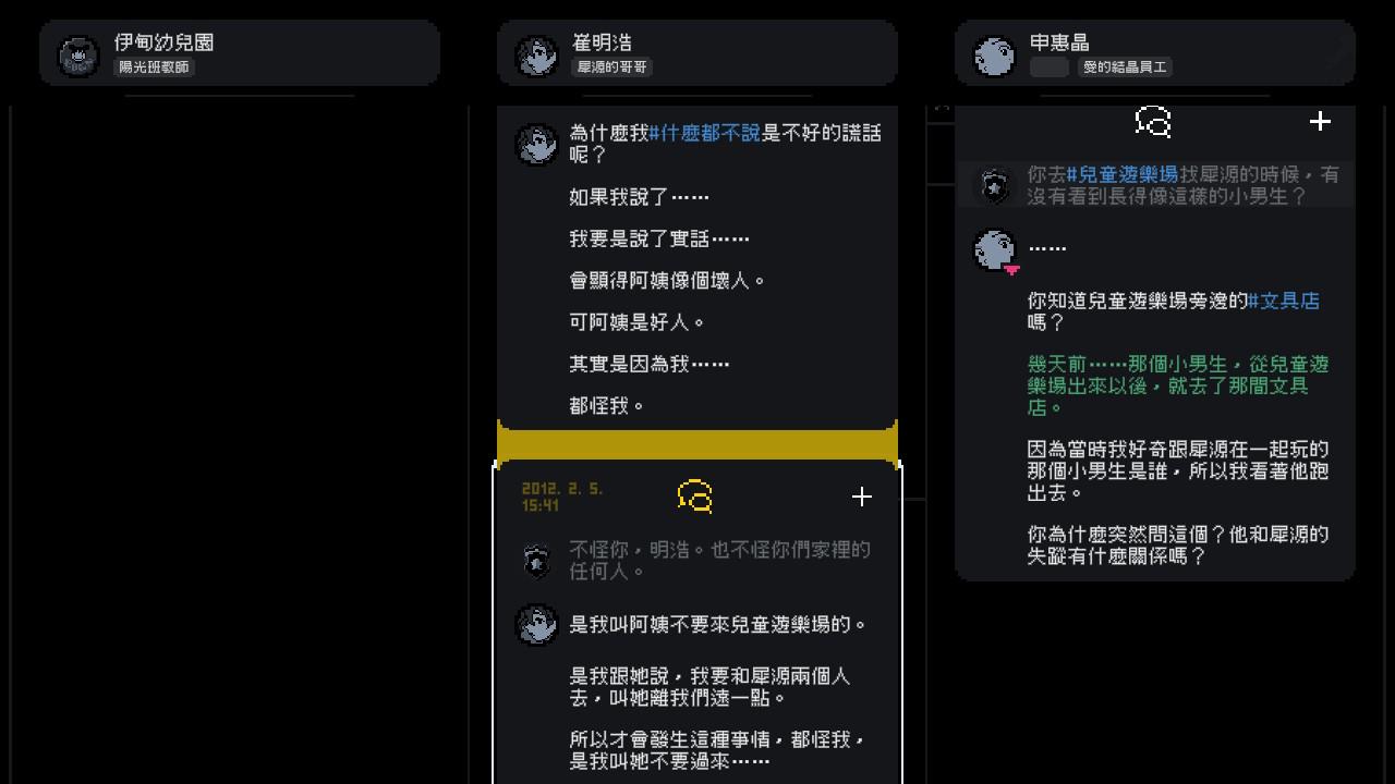 剛開始一團亂,我們只能藉由對話中的〈關鍵字〉獲取更多對話內容,所有交談內容都是〈全璟〉跟事件相關人之間的「對話」,有時候內容會被「封鎖」,需要達成特定條件才會解鎖,比如說 : 從談話間找到特定線索、根據對話內容取得相關密碼