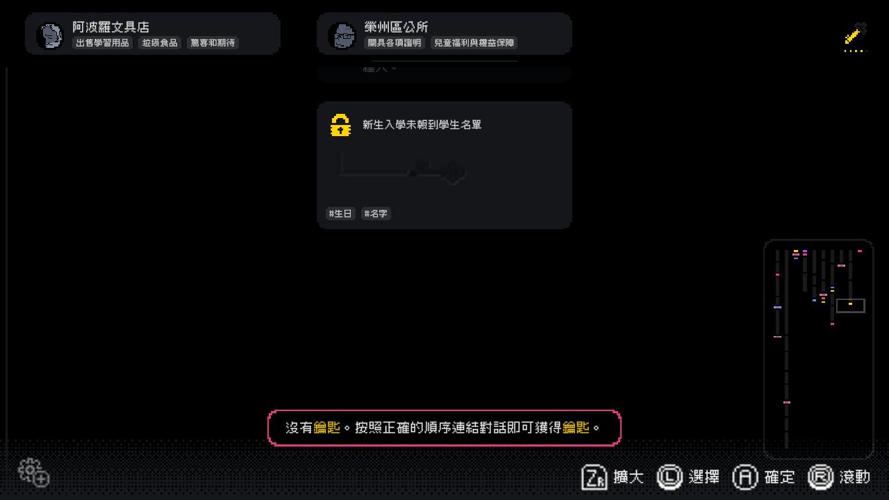 最後根據「語境」來排列對話正確的先後順序,當排列正確時,系統會自動幫內容片段進行「串接」,並取得〈鑰匙碎片〉,成功連結5段對話內容便能後取得完整的「鑰匙」,部分對話內容須使用鑰匙才能開啟