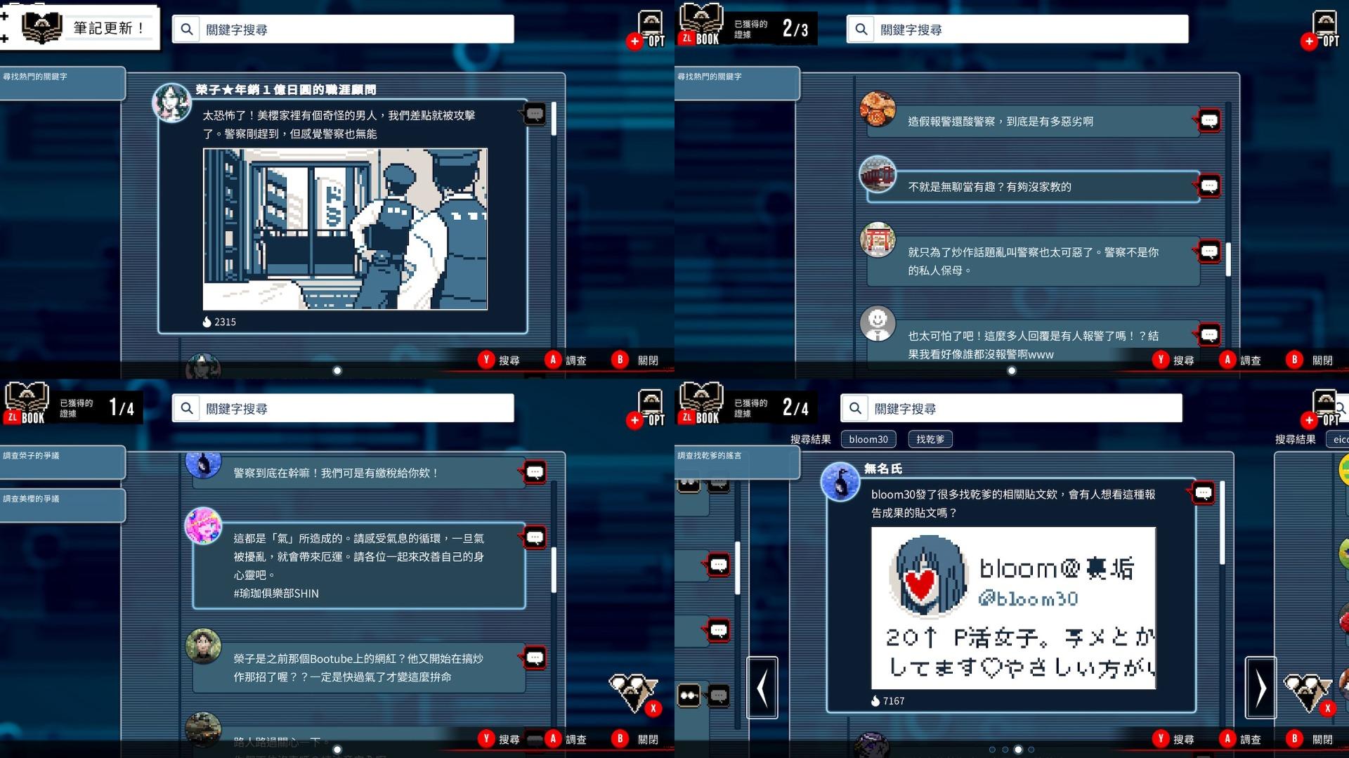 每次移動到案發現場前,主角都會利用手機上網收集資料,遊戲會show出此次事件的相關文章,很像Twitter(X)的貼文,其中夾雜無意義的酸文,以及有意義的情報