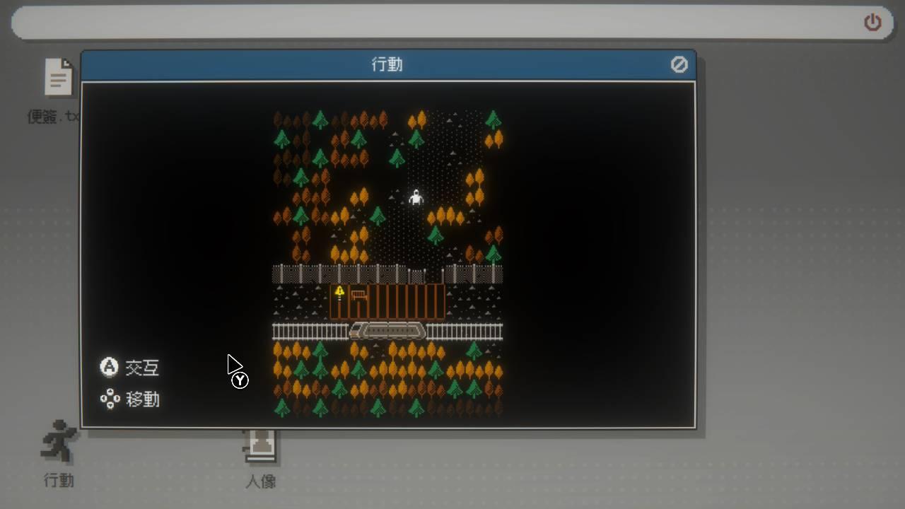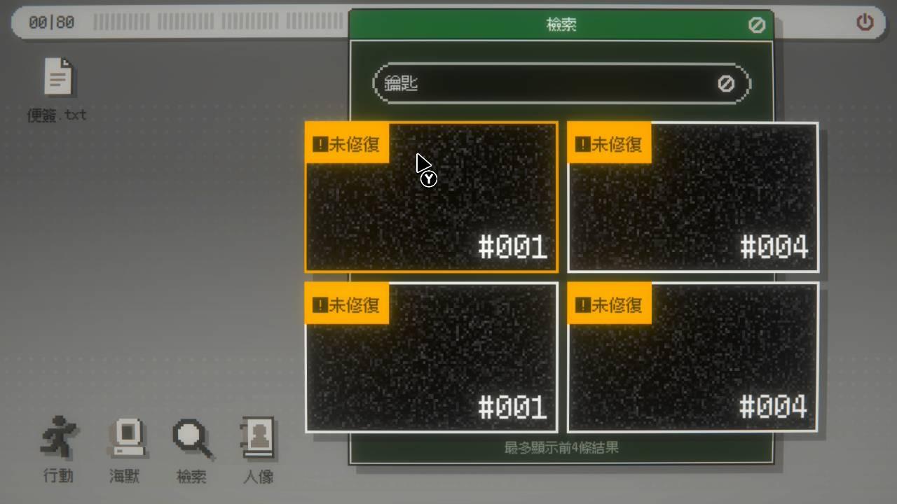 當玩家開始探索資料庫會發現不少地區都出現「資料損毀」的現象,此時我們需要利用立一個軟體〈檢索〉,如果成功輸入關鍵字(EX : 人名、地名、物品、數字),會搜尋到相關的「對話紀錄」,並通過修復能觀看內容,順便復原資料